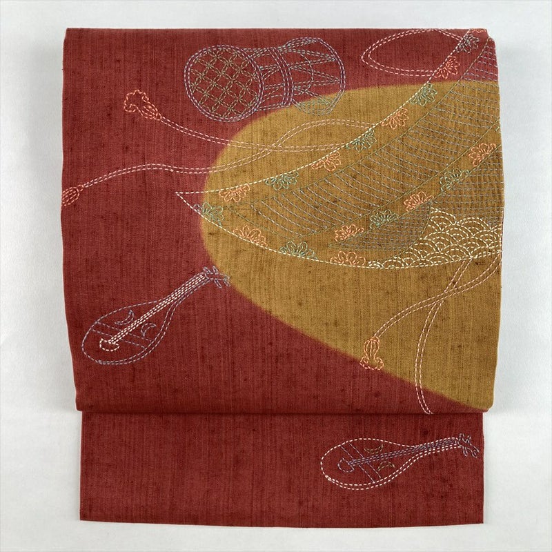 (中古)名古屋帯 臙脂 赤 カジュアル 名古屋仕立て 染め 色糸 刺し子 楽器 絹