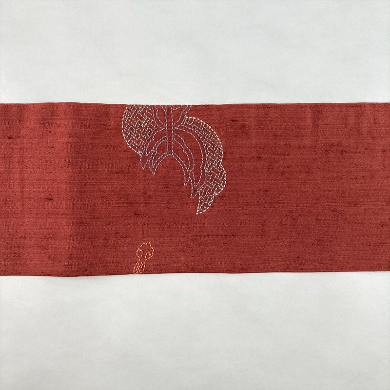 深みのある臙脂色に、趣ある刺し子模様が施された九寸名古屋帯。