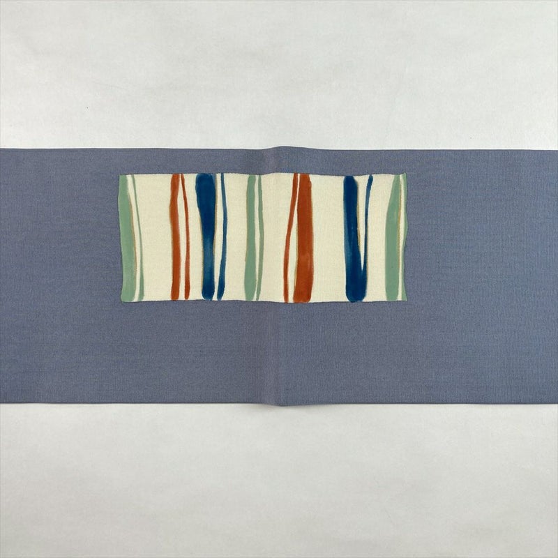 深みのあるブルーグレーの塩瀬地に、職人が手描きで柄を施した名古屋帯です。