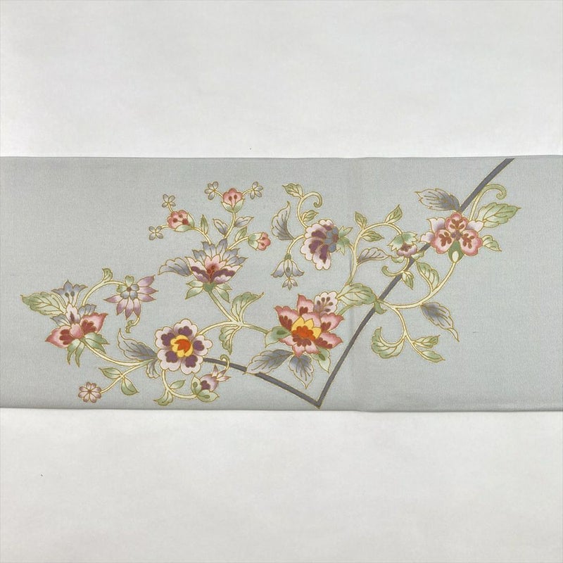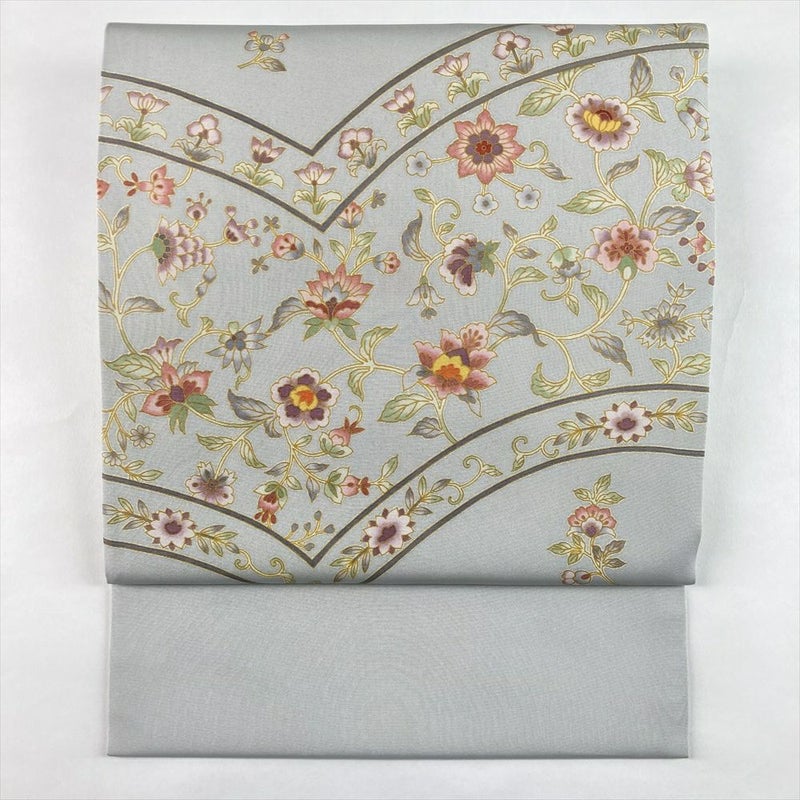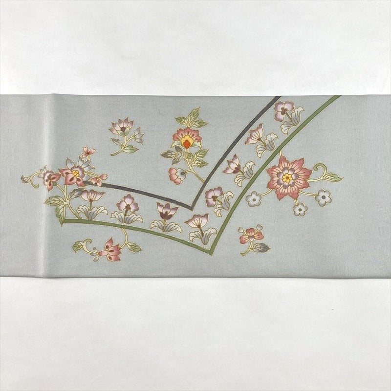 (中古)名古屋帯 薄青磁 カジュアル 名古屋仕立て 塩瀬 染め 天平 花草文 絹