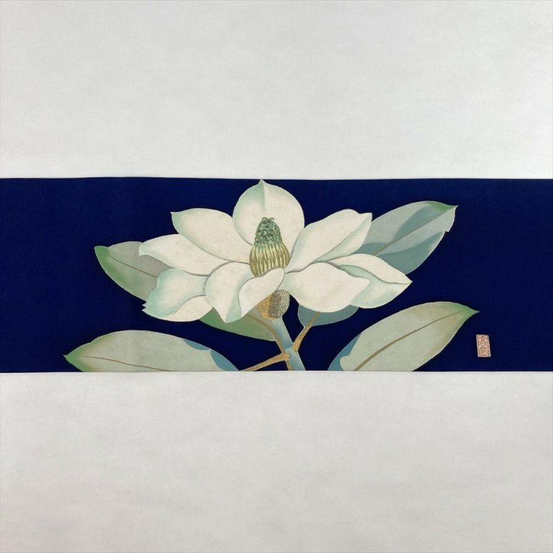 濃紺の塩瀬地に、金彩を添えて描かれた白いクチナシがしっとりと咲き誇る名古屋帯。