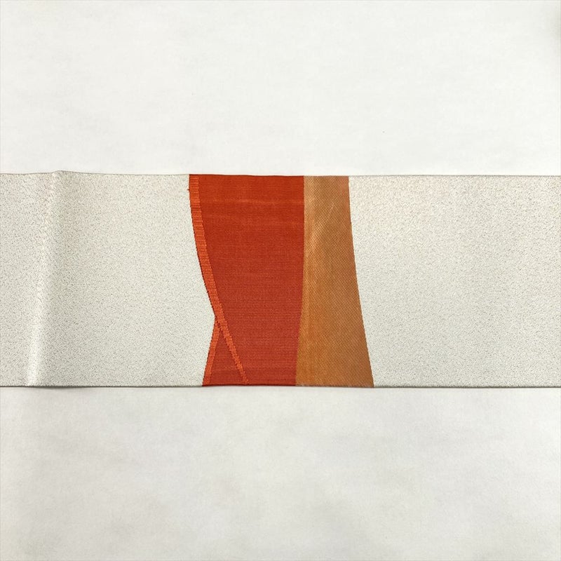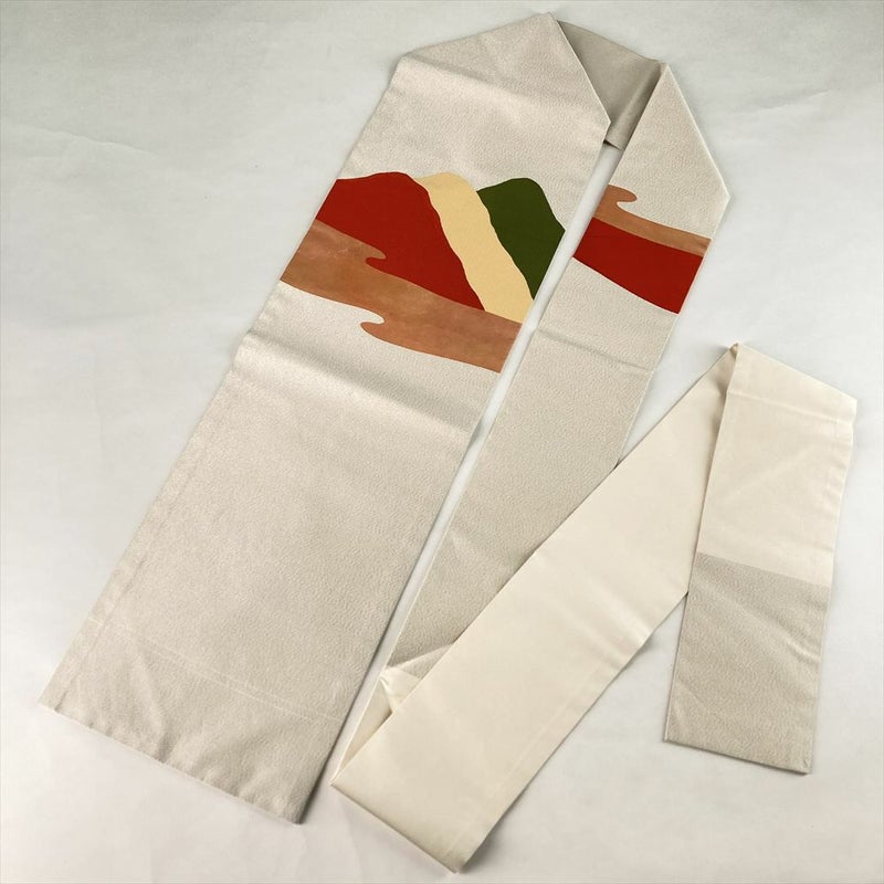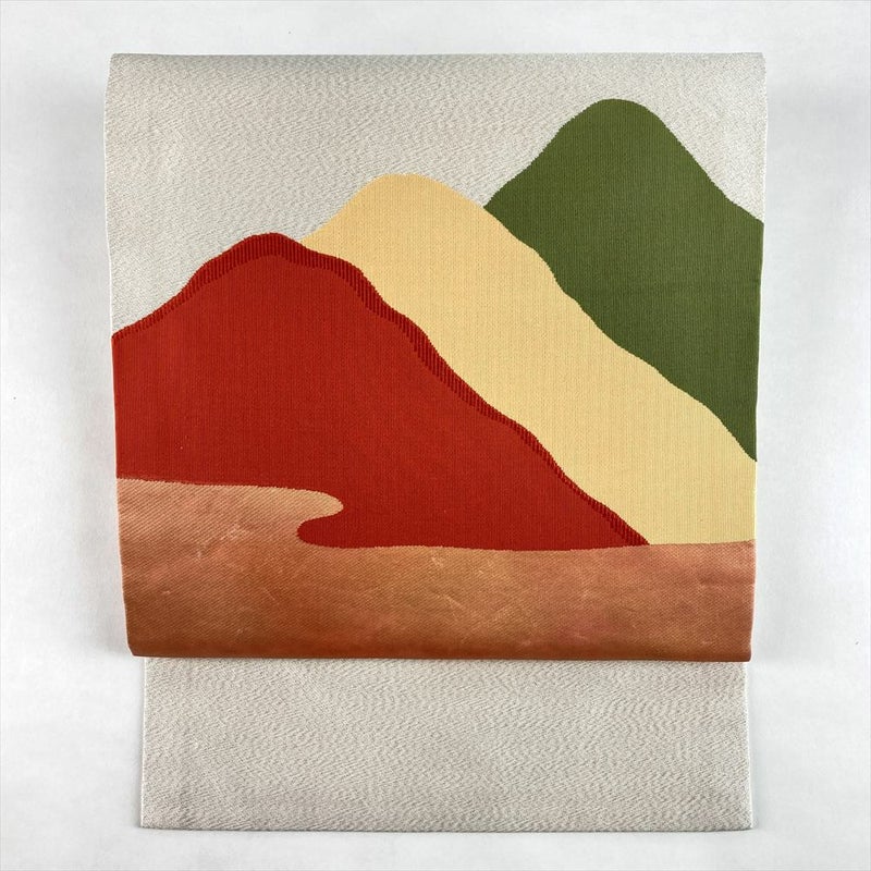 白銀の地に、銀糸で織り出された山並みと霞が、カラフルな彩りで広がる名古屋帯。