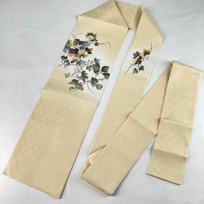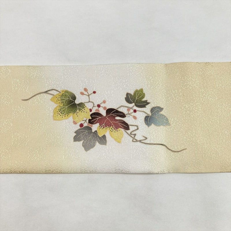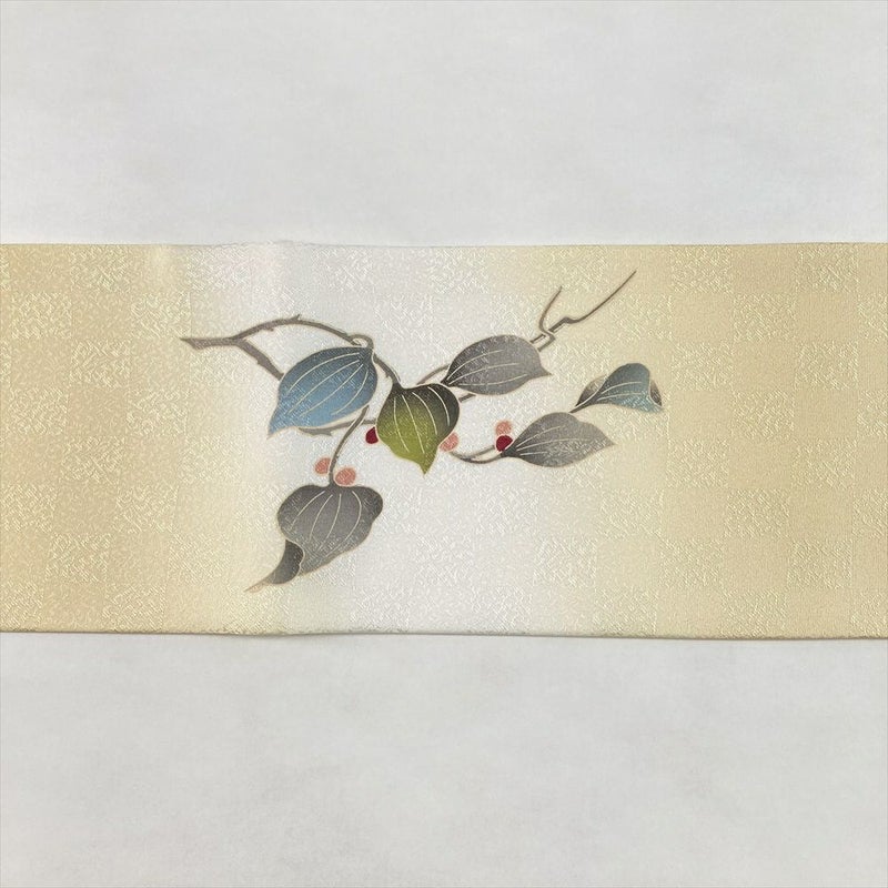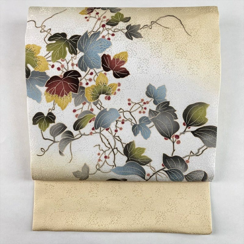 清々しい淡黄(うすき)の地に、蔦の葉実を優しく染め上げた九寸名古屋帯です。