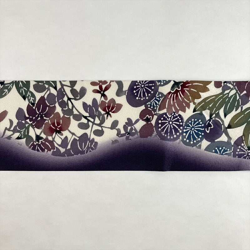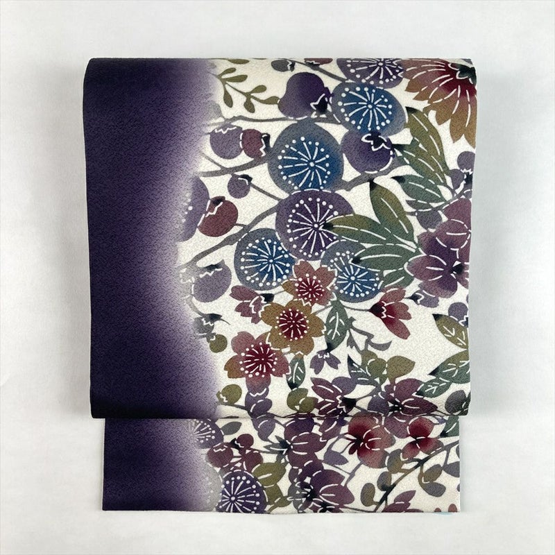 命吹き込む型絵染め。紫系の花咲く九寸名古屋帯
