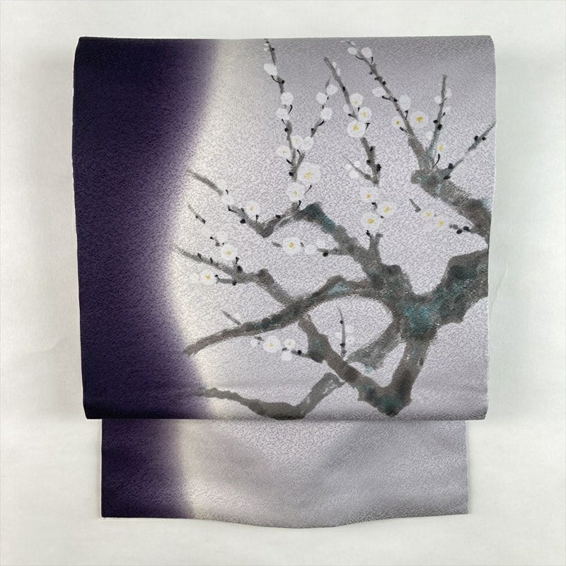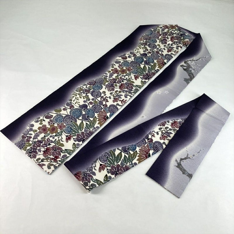 (中古)名古屋帯 濃紫 カジュアル リバーシブル 名古屋仕立て 染め 四季の草花 梅 絹