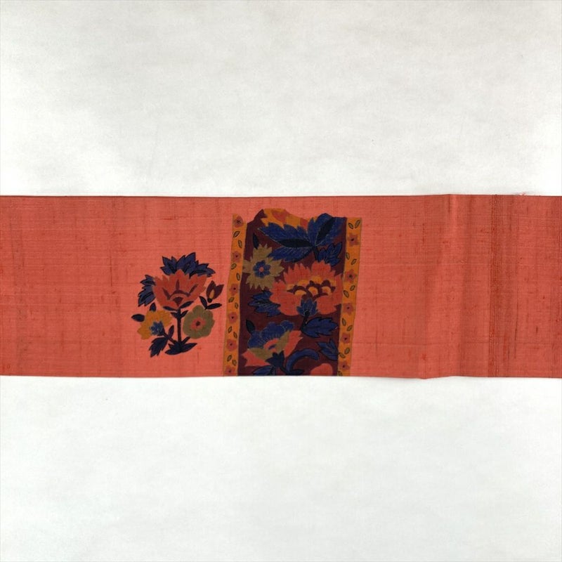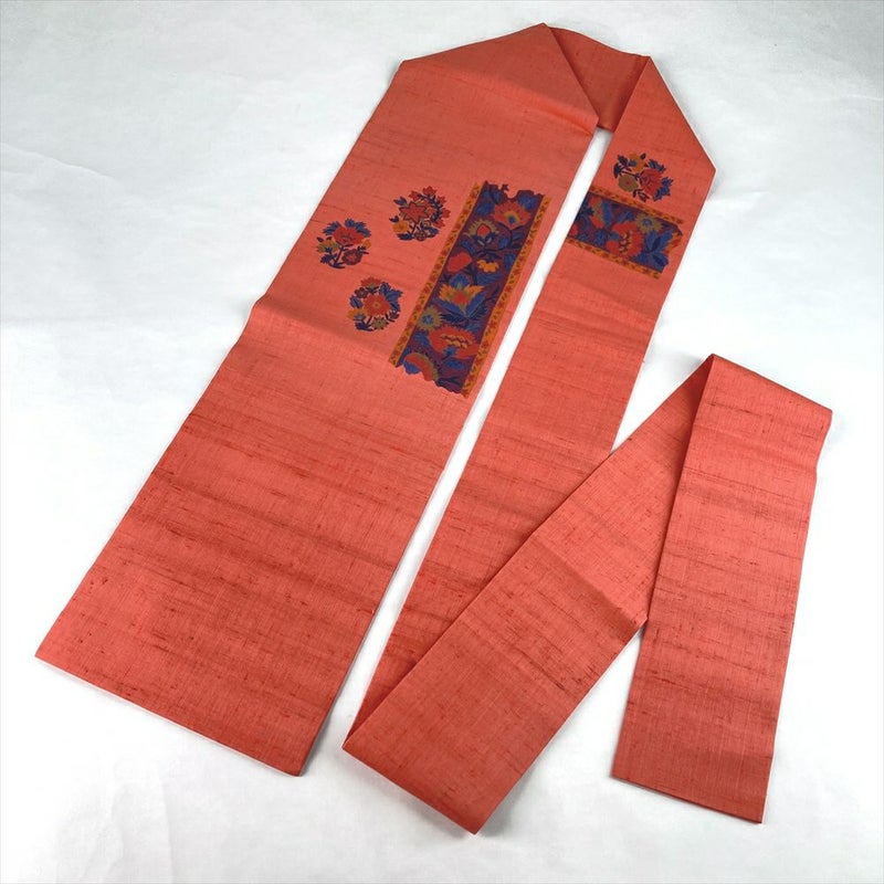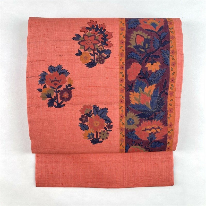 (中古)名古屋帯 珊瑚 ピンク カジュアル 名古屋仕立て 紬地 手描き オリエンタル 花草文 絹