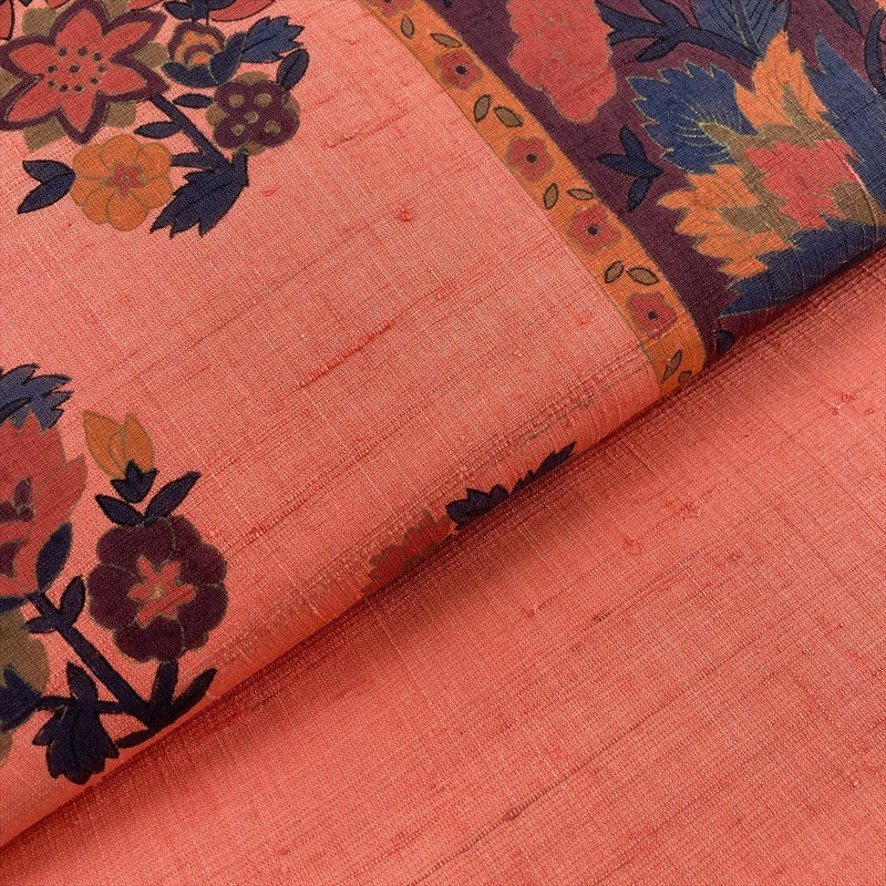 【色柄】珊瑚 ピンク カジュアル オリエンタル 花草文 紬地 手描き