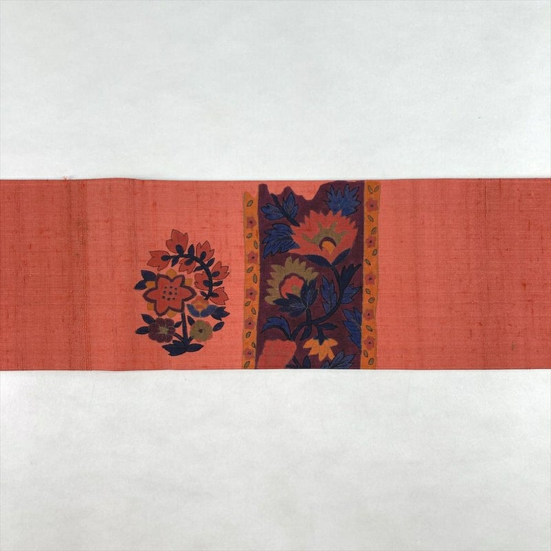 珊瑚色の紬地に描かれたオリエンタルな花草文が魅力的。