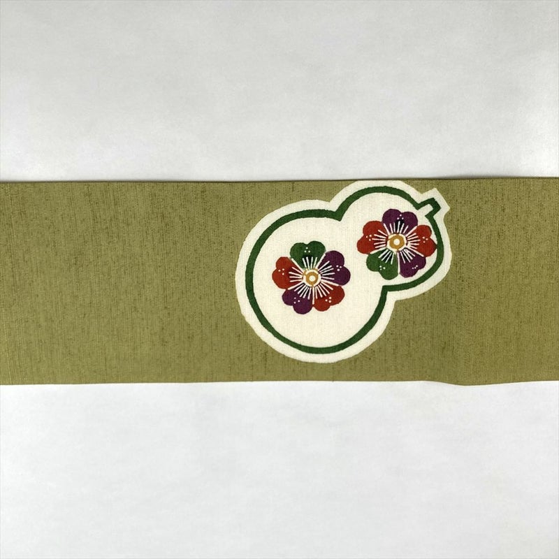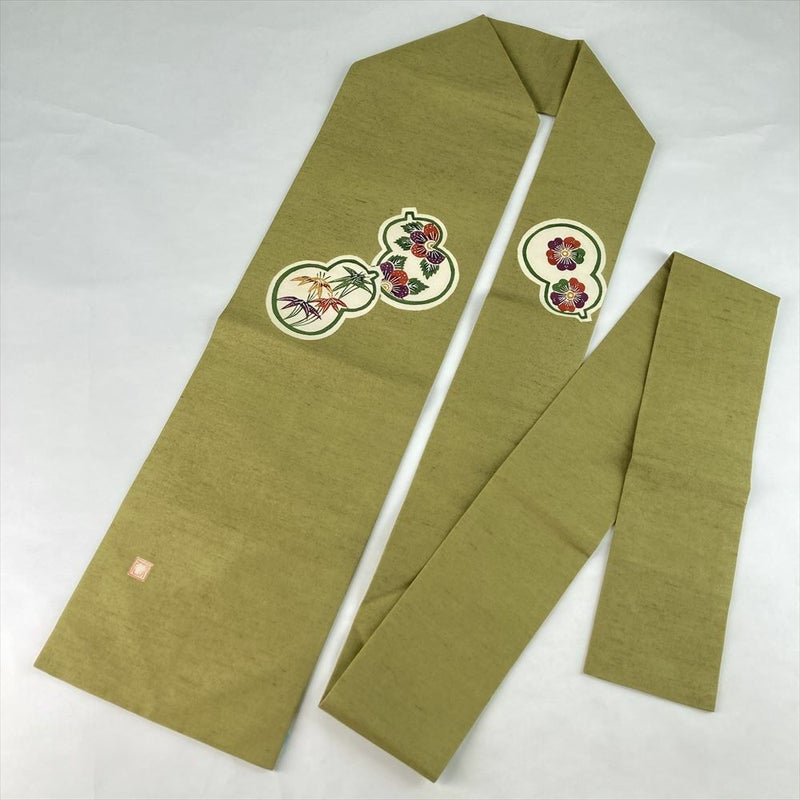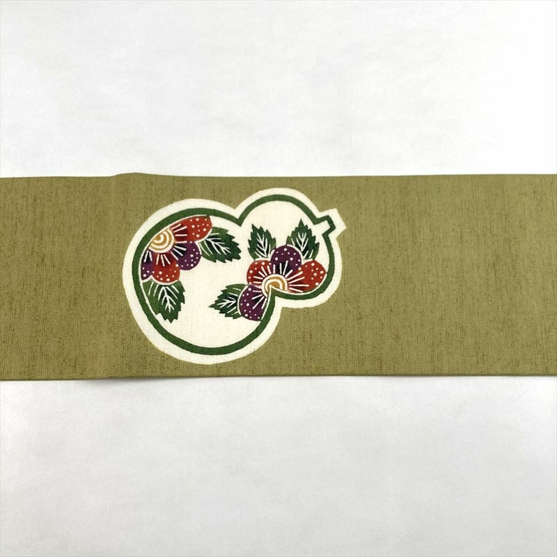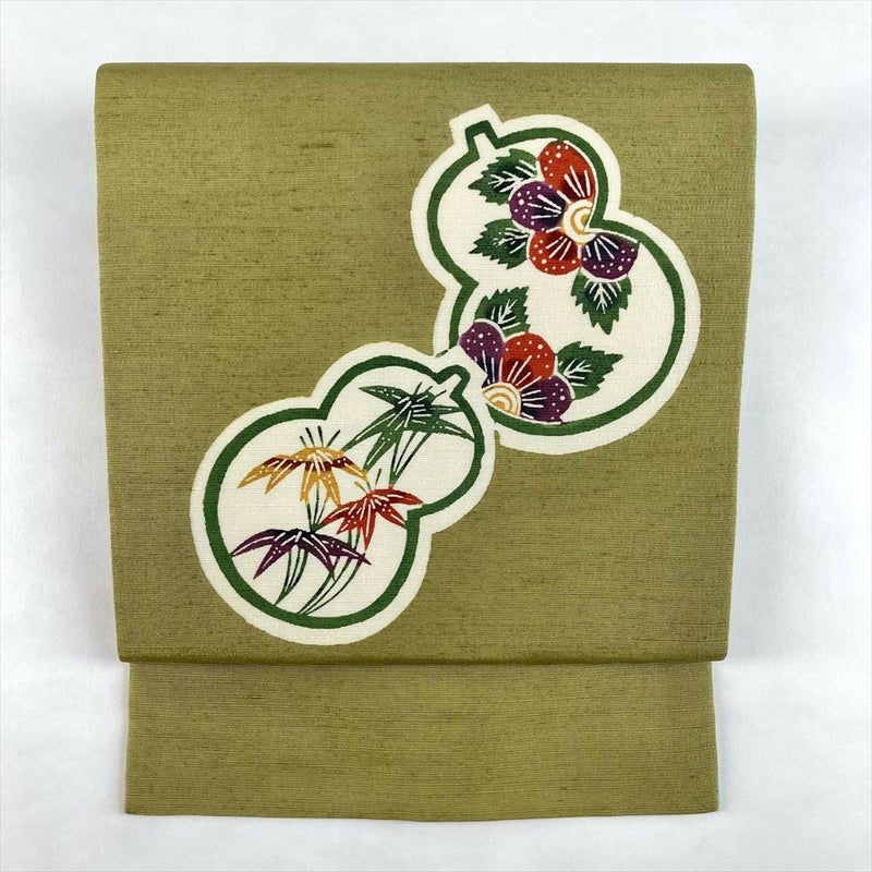 (中古)名古屋帯 鶯色 緑 カジュアル 名古屋仕立て 紬地 染め 瓢箪に華 笹 絹
