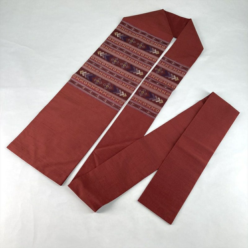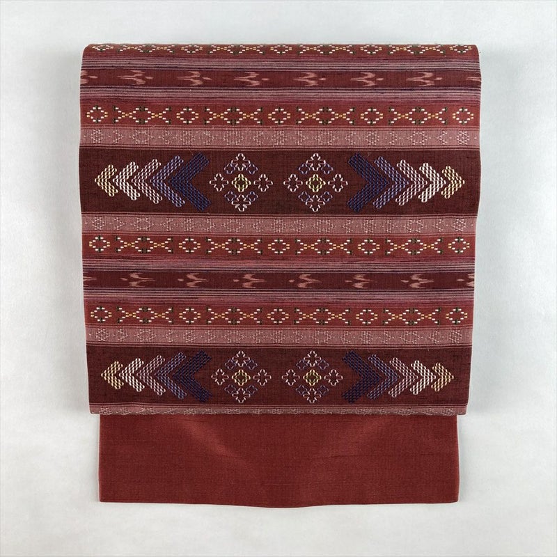 (中古)名古屋帯 臙脂 赤 カジュアル 名古屋仕立て 織り 花織 絹