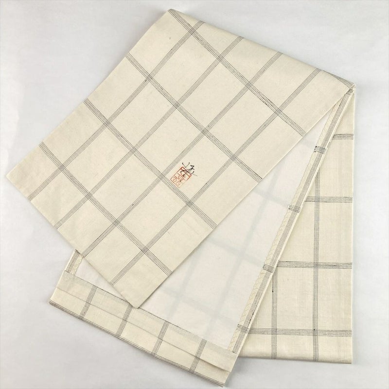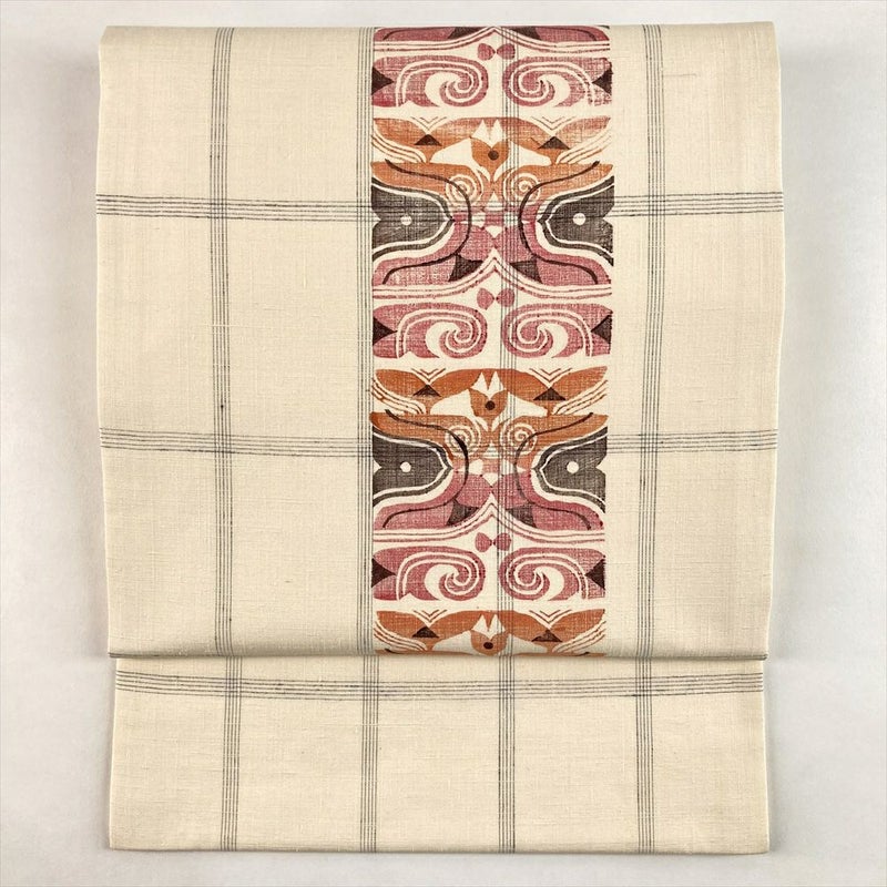 白茶の地にこうげい織と型絵染で花草文を表現した名古屋帯。