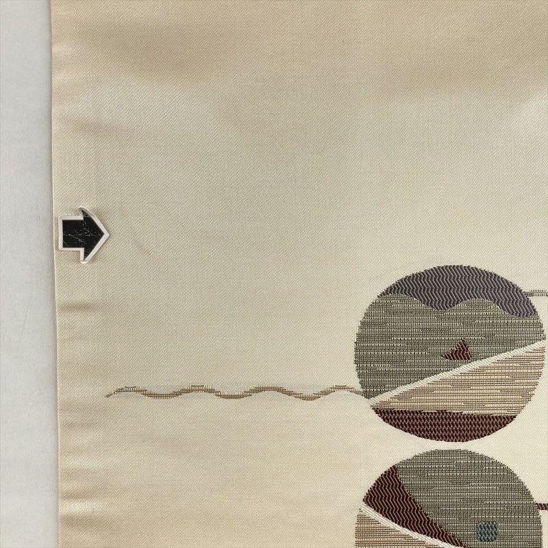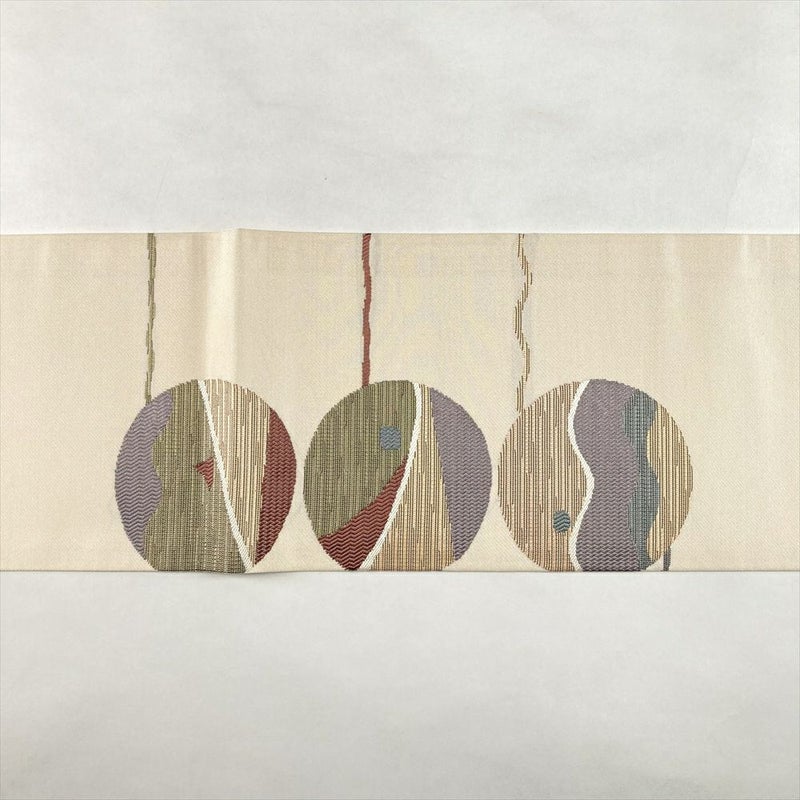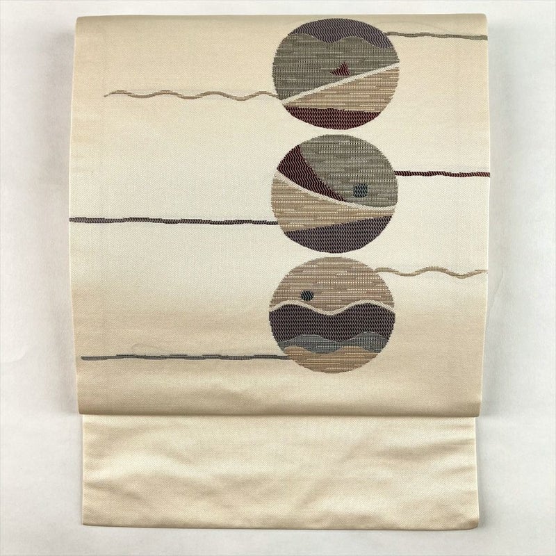 白茶地に丸や線の抽象柄を織り込んだ名古屋帯。