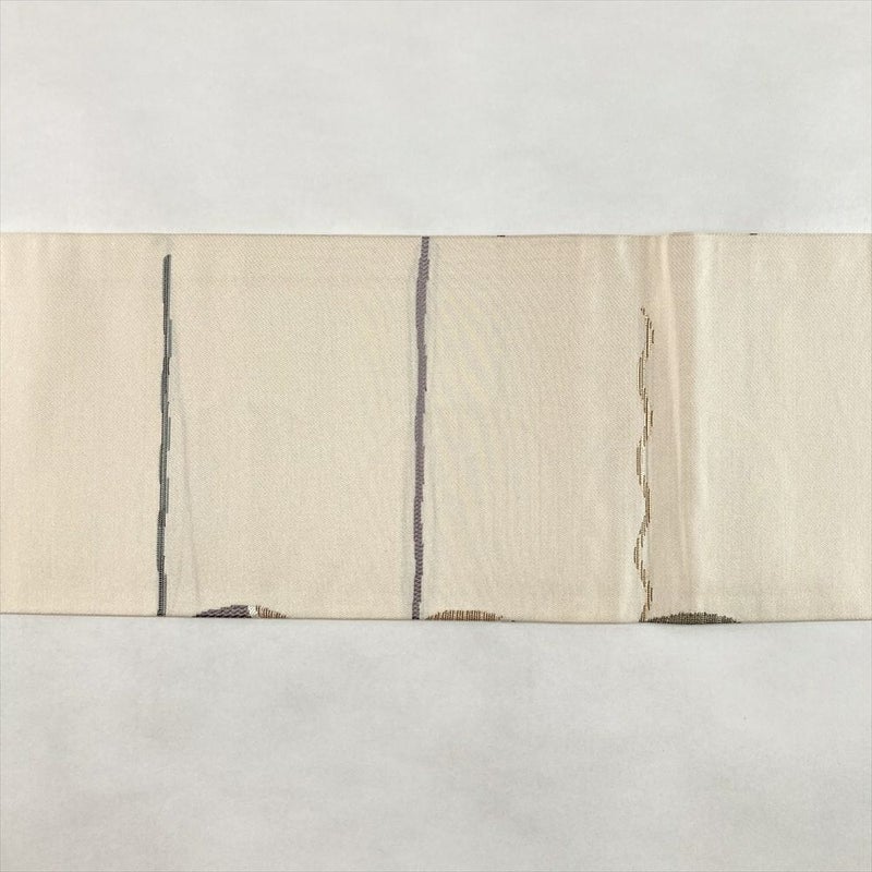 (中古)名古屋帯 白茶 ベージュ カジュアル 名古屋仕立て 織り 丸 線 抽象柄 絹