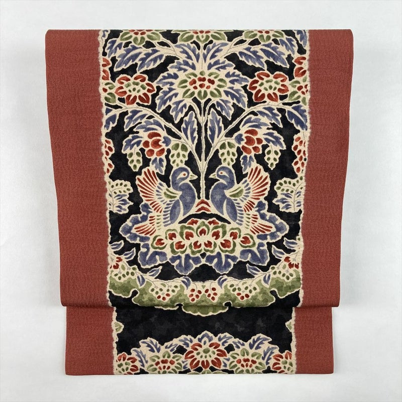 (中古)名古屋帯 薄赤 墨黒 カジュアル 名古屋仕立て 染め 絞り 樹下双鳥 絹