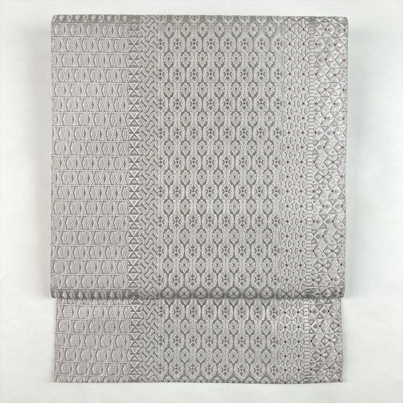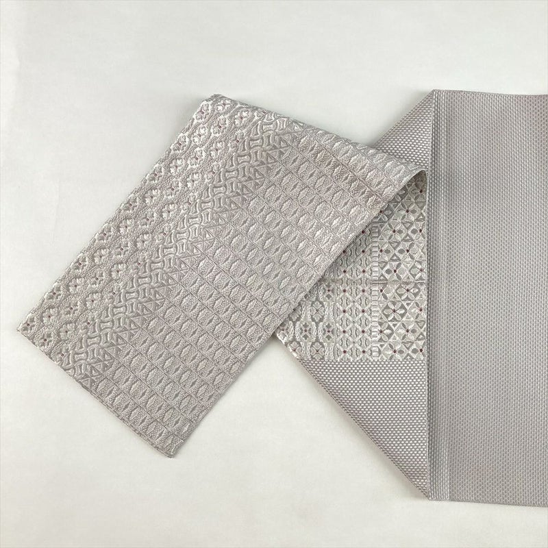 (中古)名古屋帯 薄灰紫 グレー カジュアル 松葉仕立て 織り 立涌華文 吉祥文 絹