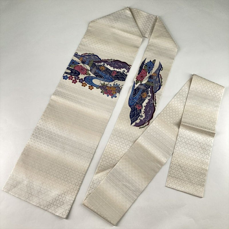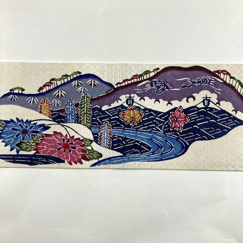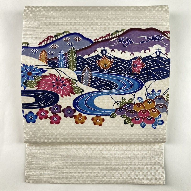 (中古)名古屋帯 アイボリー カジュアル 名古屋仕立て 琉球紅型 景色文 絹