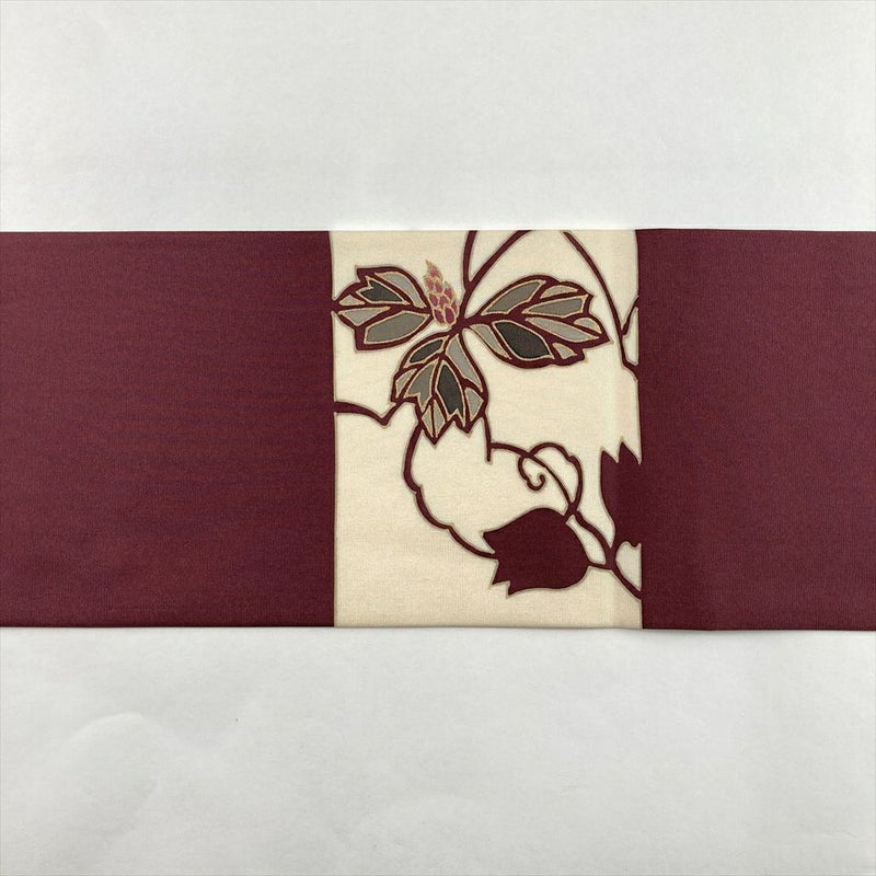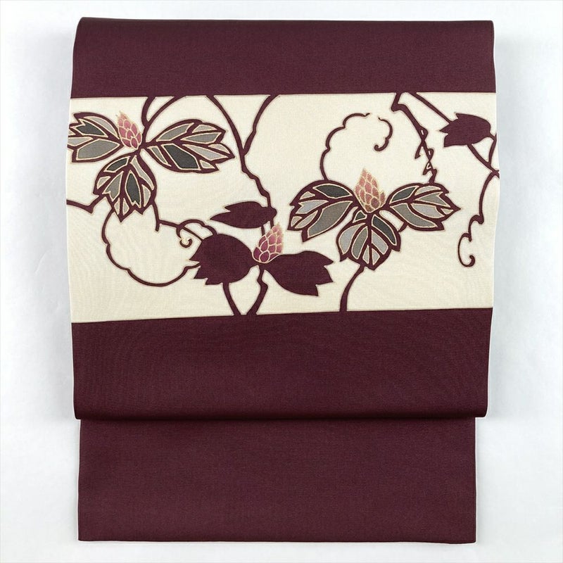 (中古)名古屋帯 小豆色 赤紫 カジュアル 名古屋仕立て 塩瀬 染め 蔓葉に実 絹