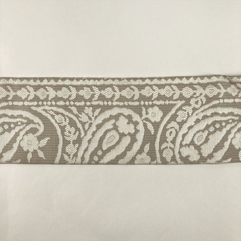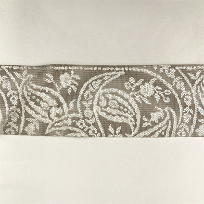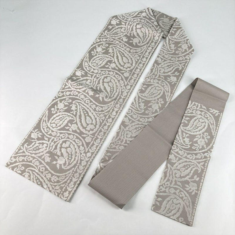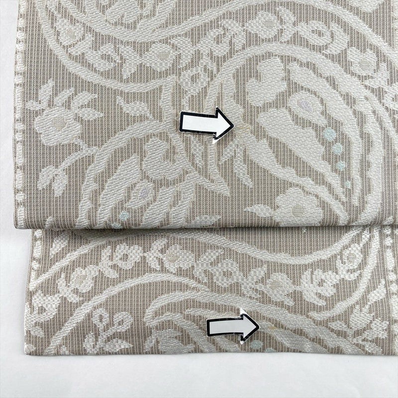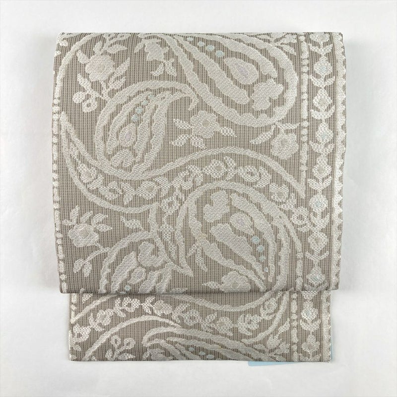 (中古)名古屋帯 グレージュ カジュアル 名古屋仕立て 織り ペイズリー 絹