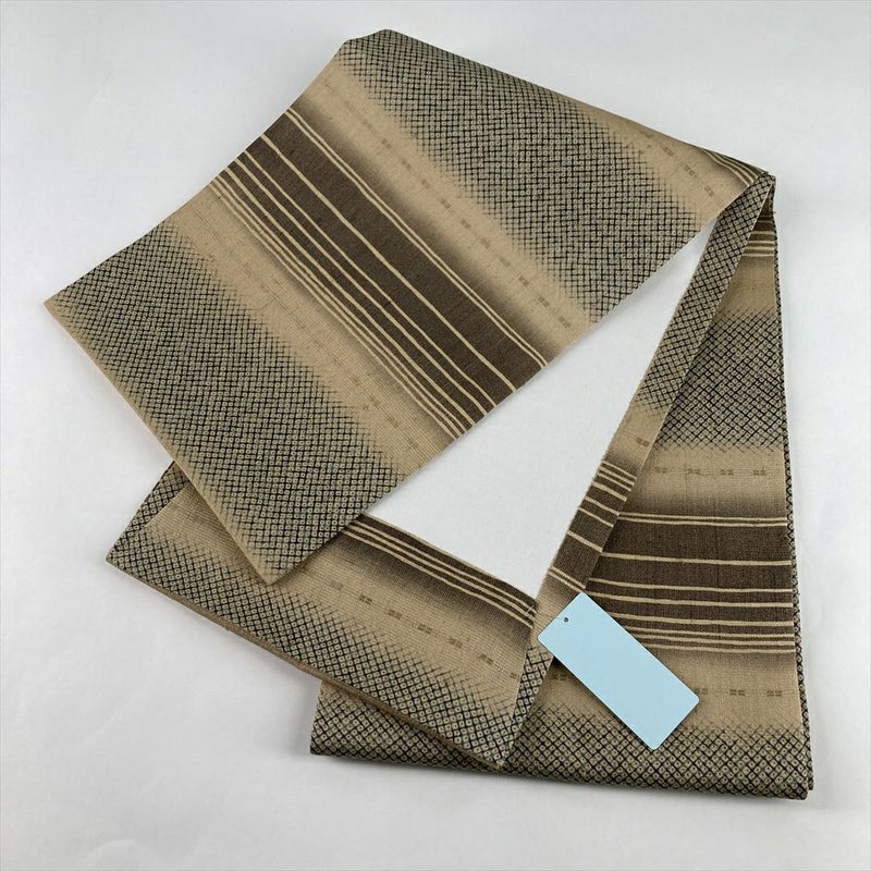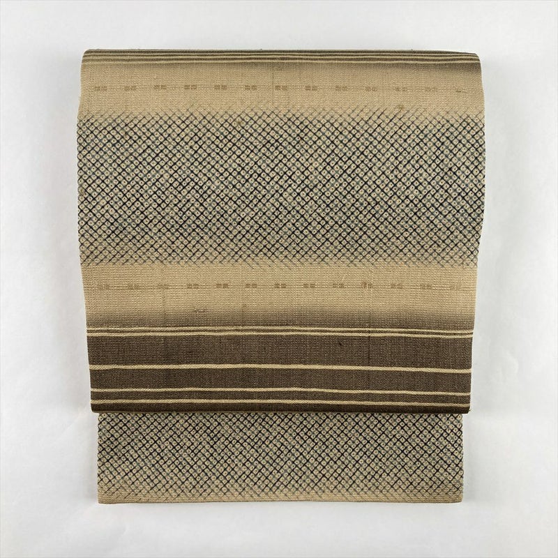 (中古)名古屋帯 薄茶 カジュアル 開き仕立て 織り染め 横段 染め疋田 絹