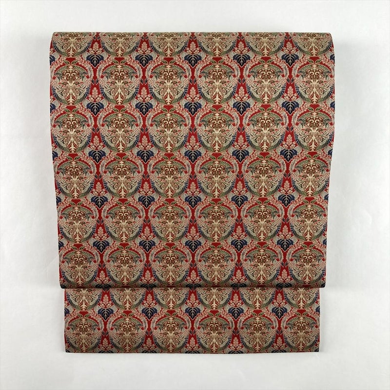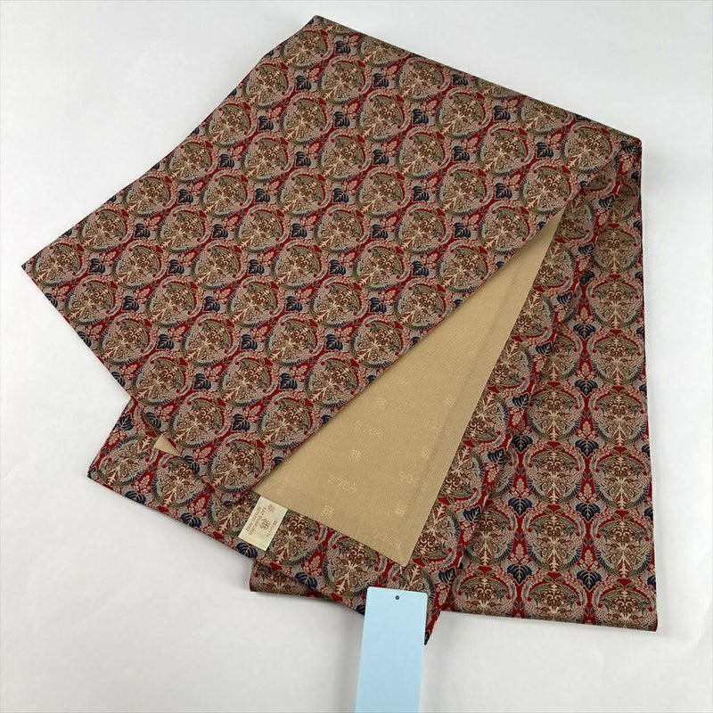 (中古)名古屋帯 赤 カジュアル 開き仕立て 織り 桐に向い鳳凰丸文錦 絹