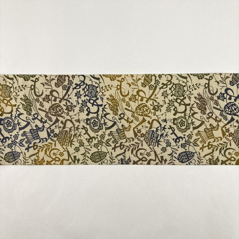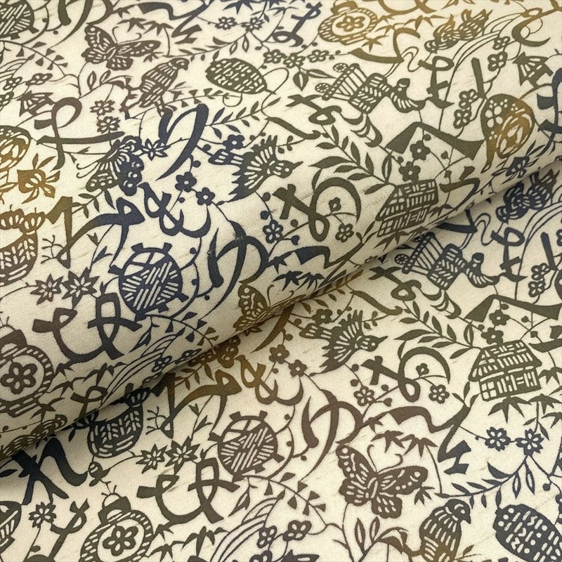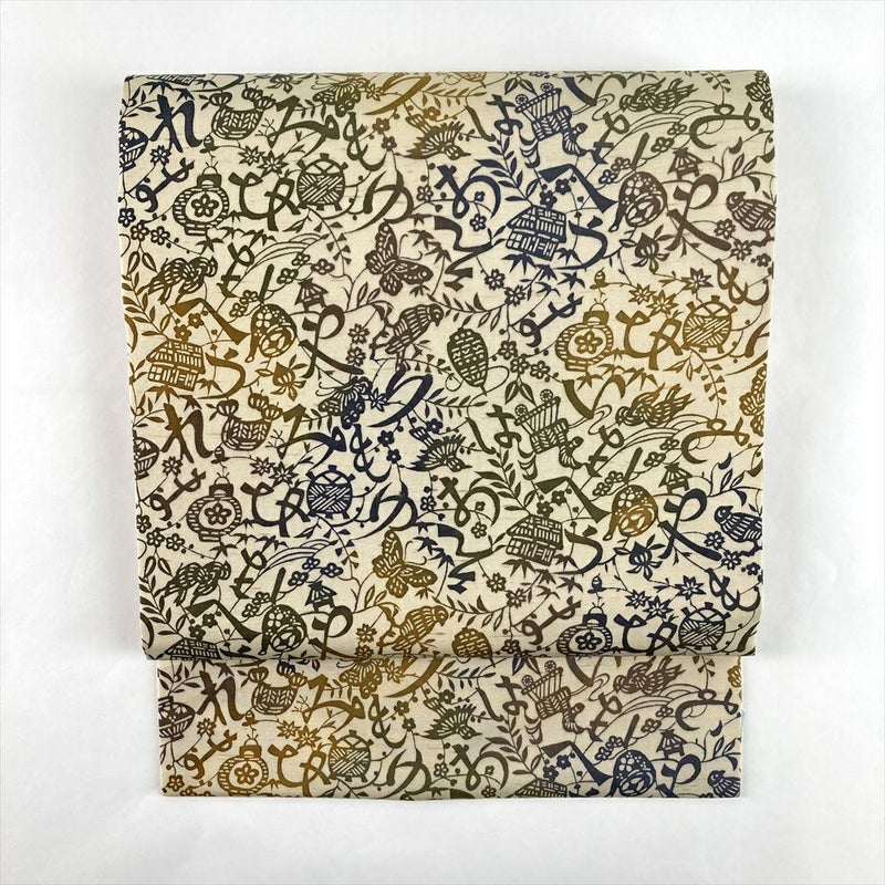 やわらかな薄黄に染められた紬地に、いろは文字が遊び心を添える名古屋帯です。