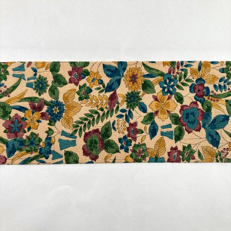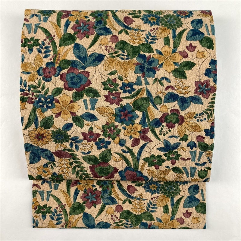 (中古)名古屋帯 ベージュ カジュアル 名古屋仕立て 染め 花草 絹
