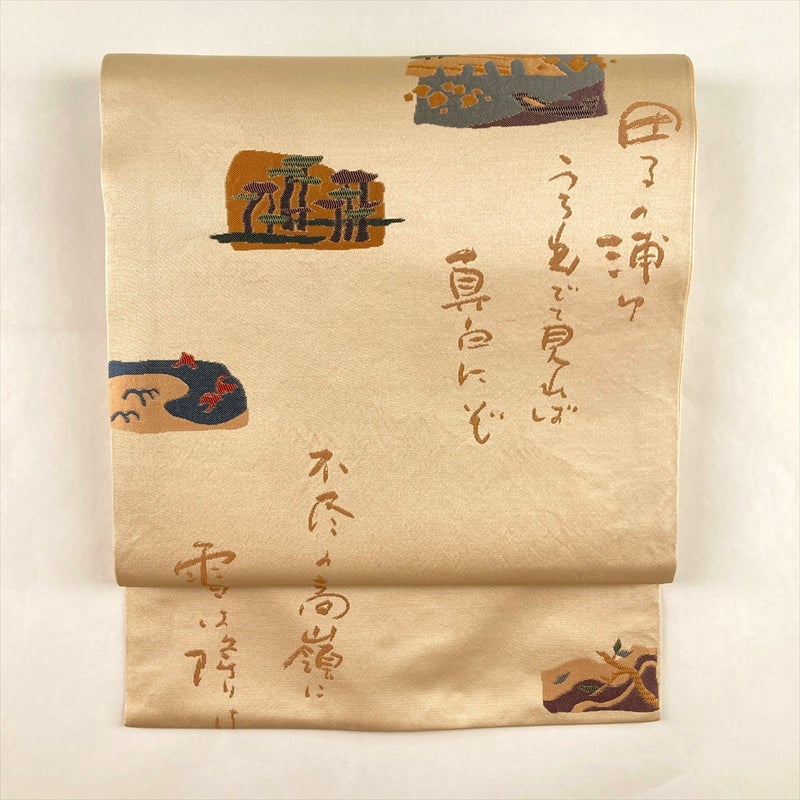 (中古)名古屋帯 生成り ベージュ カジュアル 名古屋仕立て 織り 百人一首 絹
