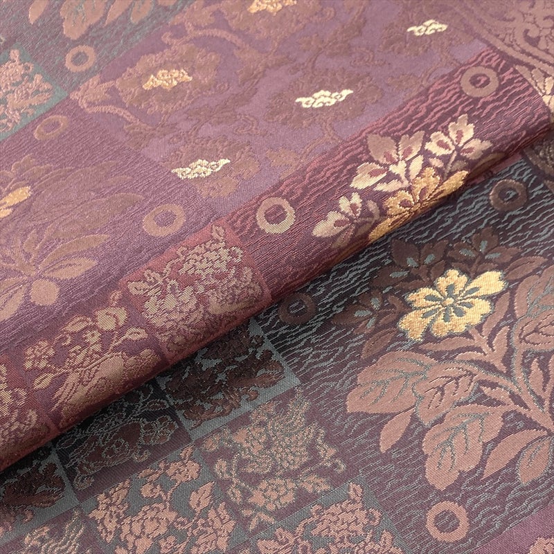 落ち着いた小豆色に引き箔の光沢が重なり、格調高い天平文様が静かに浮かびます。