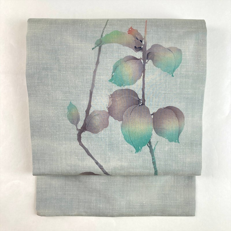 (中古)名古屋帯 薄灰 グレー カジュアル 名古屋仕立て 紬地 染め 枝葉 絹