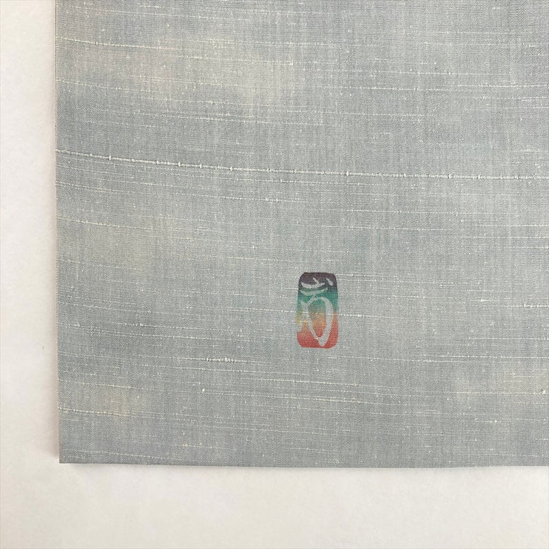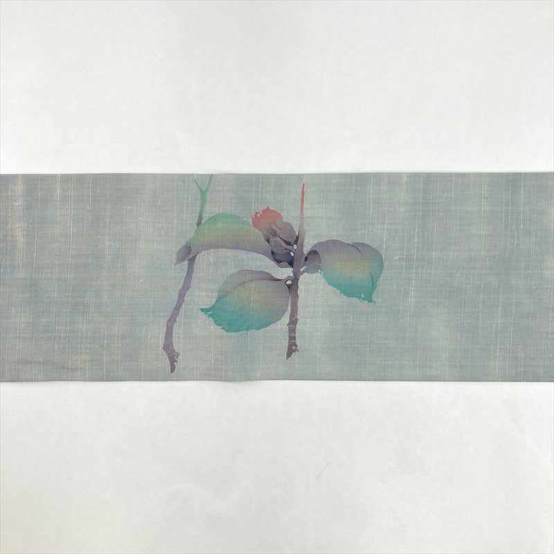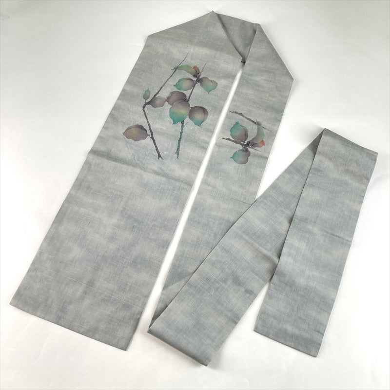 洗練された薄灰の紬地に、作家の確かな筆致で描かれた枝葉の意匠が美しく映えます。
