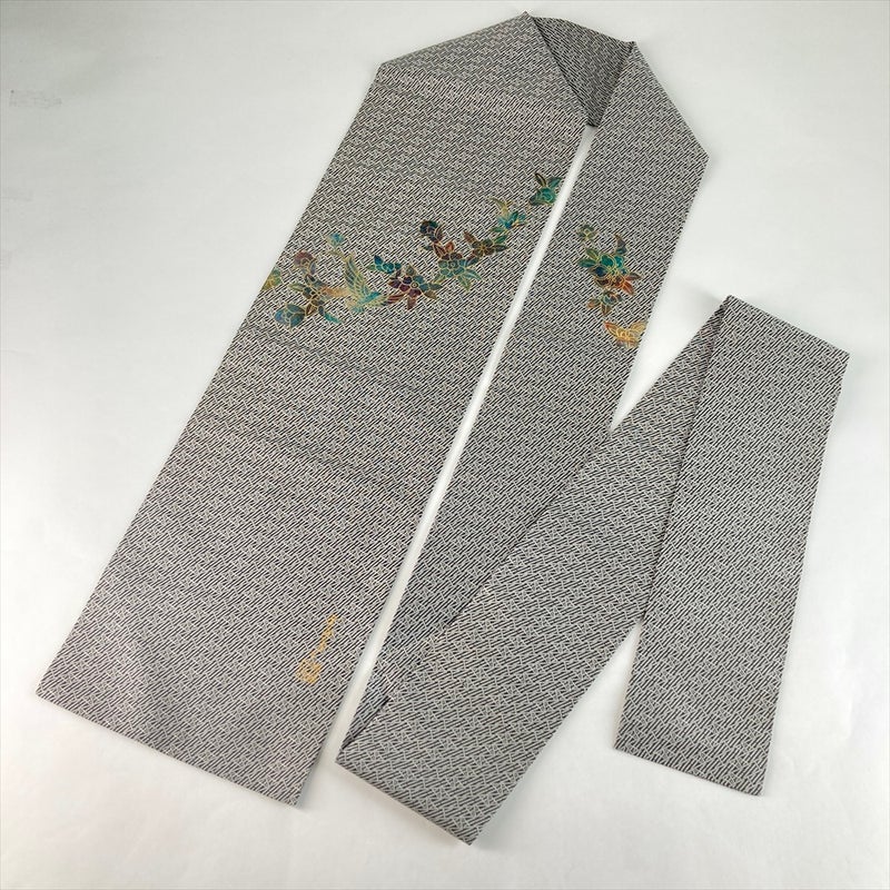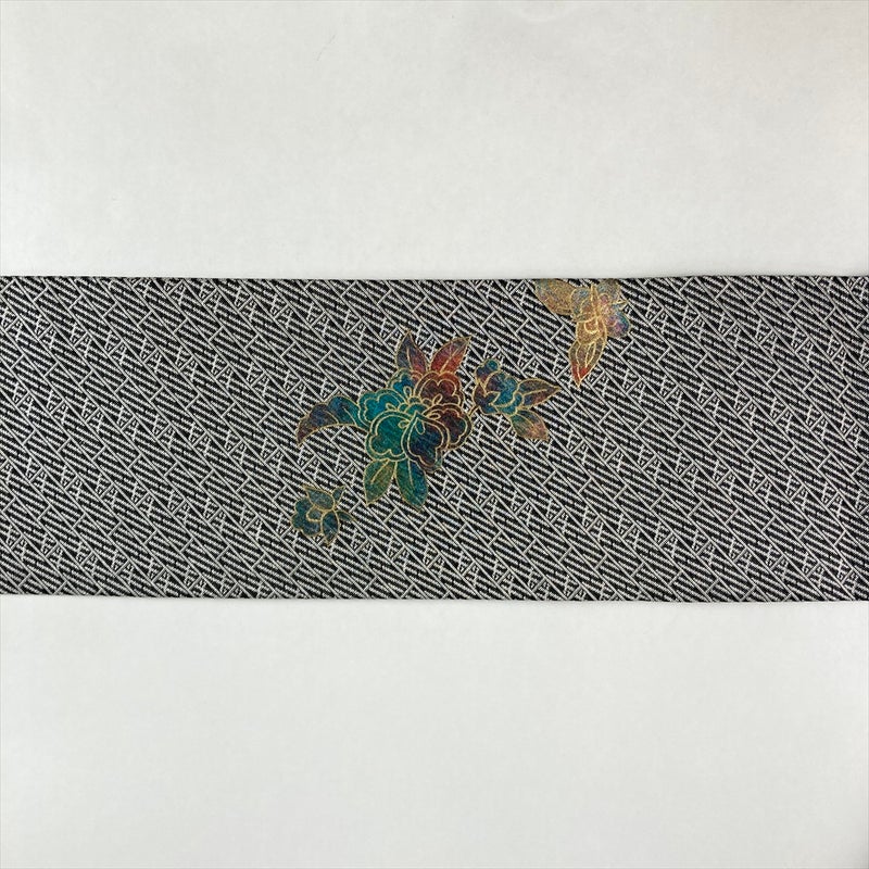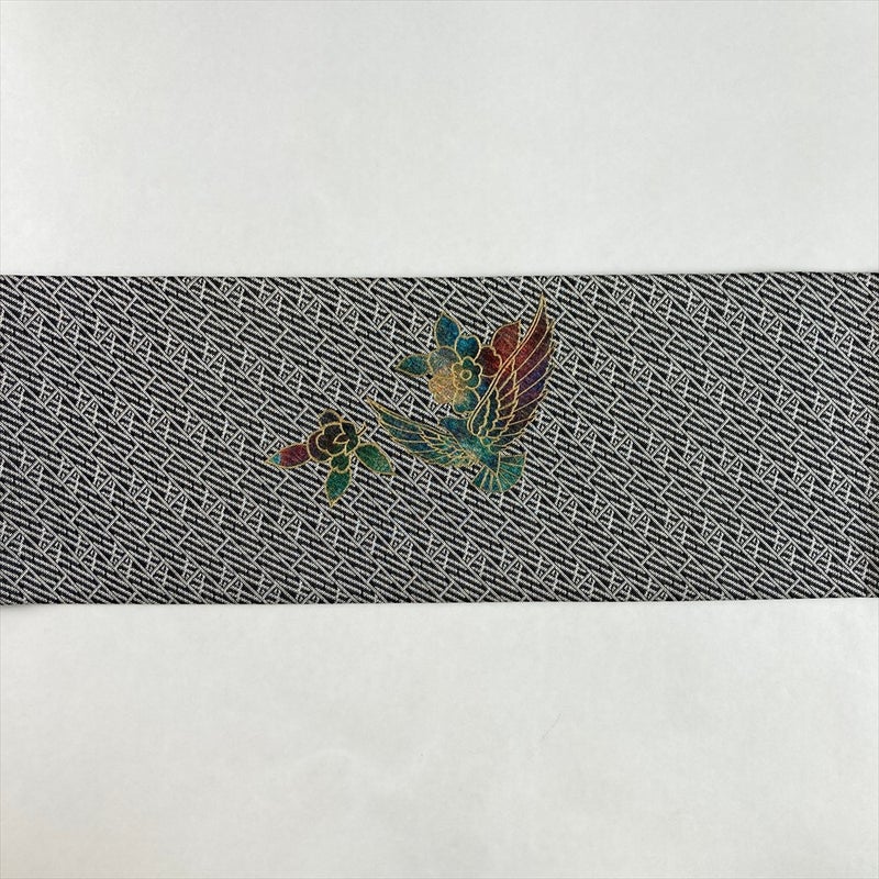 (中古)名古屋帯 黒 白 カジュアル 名古屋仕立て 織り 金彩 花鳥 斉藤三才 絹
