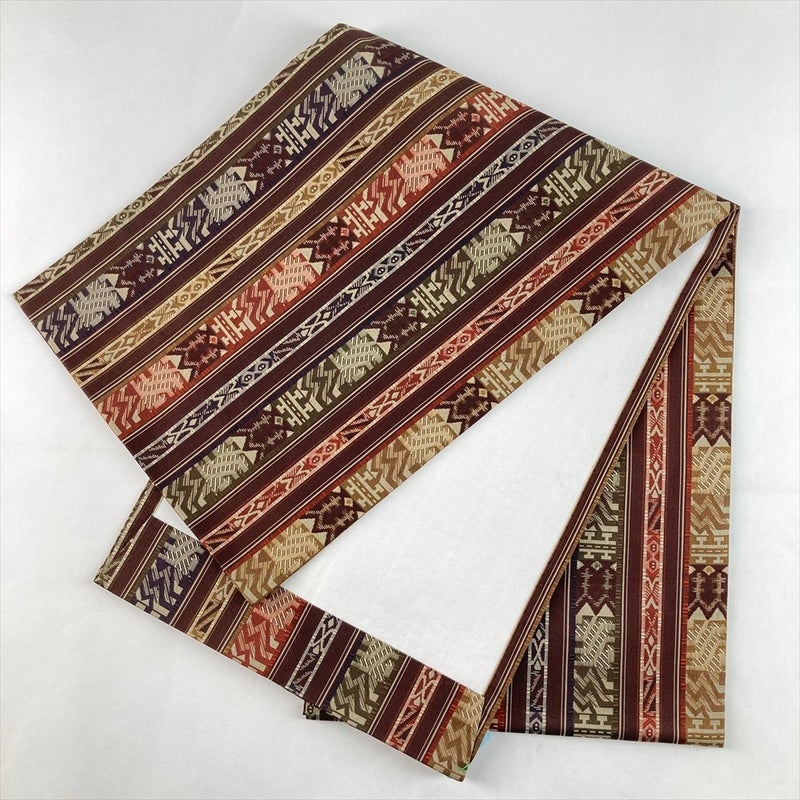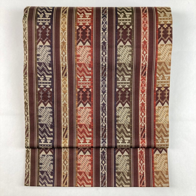 落ち着いた茶色地に縦縞を基調とした、オリエンタルな雰囲気が漂う九寸名古屋帯。