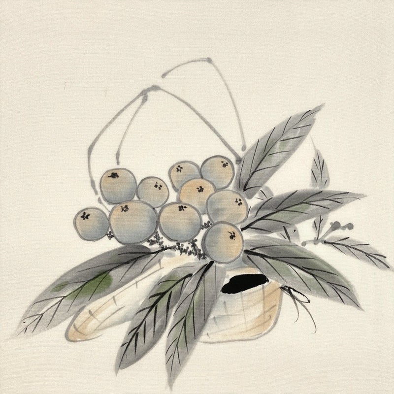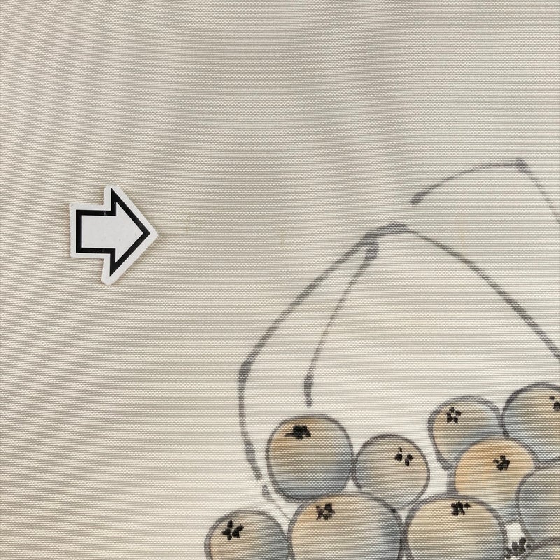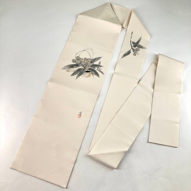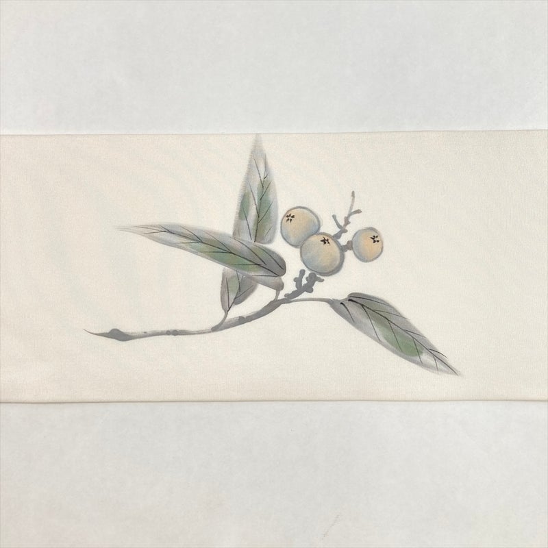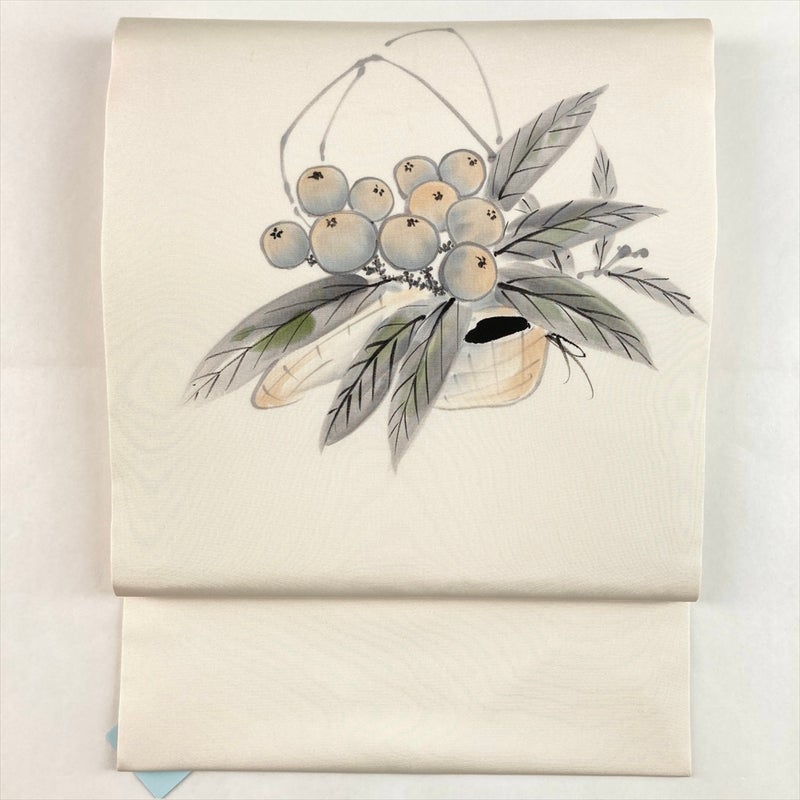 清らかな白地に、手描きならではの温もりを感じる果実文様をあしらった九寸名古屋帯。