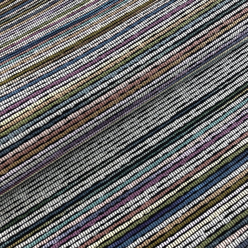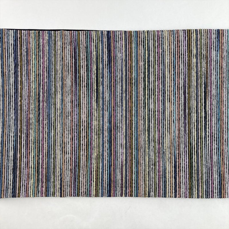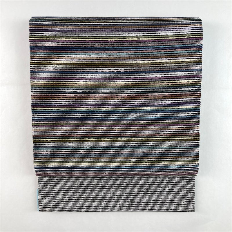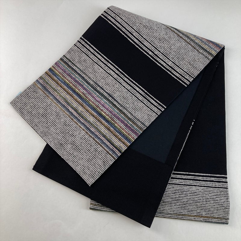 深みのある黒地に、織りで表現された多色の横縞模様が映える九寸名古屋帯。