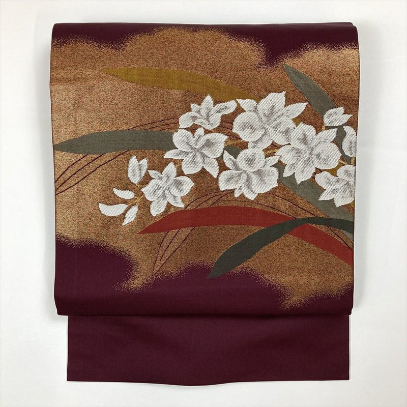 (中古)リユース帯 名古屋帯 赤紫 カジュアル 切箔 金糸 銀糸 花 葉 名古屋仕立て 未洗い MS1054