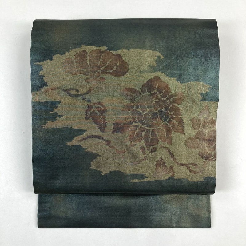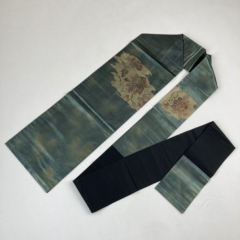 (中古)九寸名古屋帯 深緑 玉虫色 カジュアル 切箔 ぼたん 名古屋仕立て 未洗い