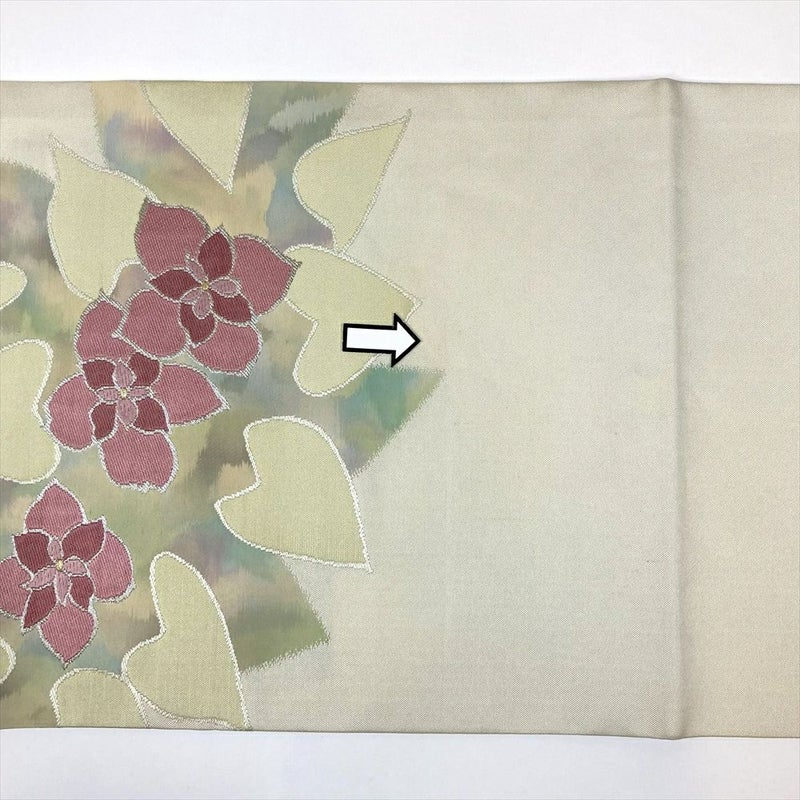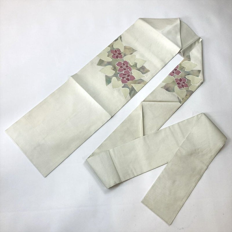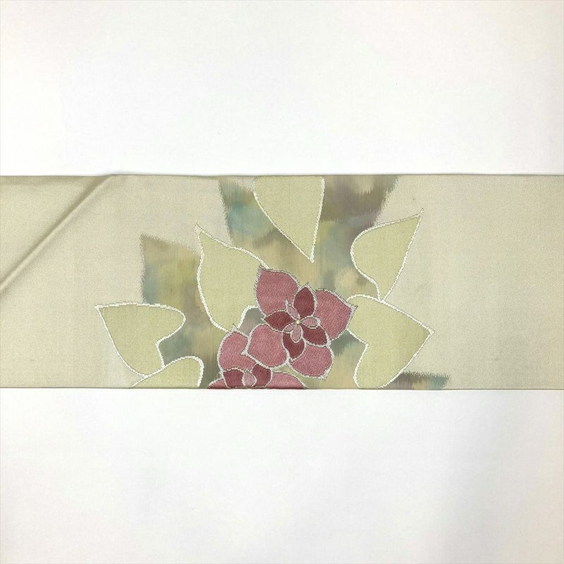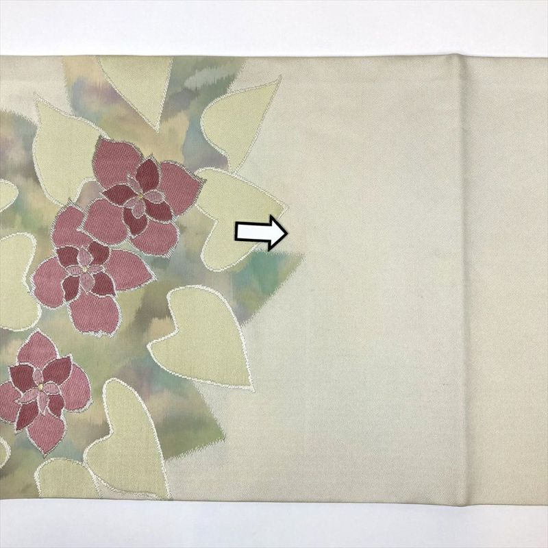(中古)名古屋帯 生成り カジュアル うるし箔調 銀糸 色糸 花 葉 名古屋仕立て 未洗い MS867