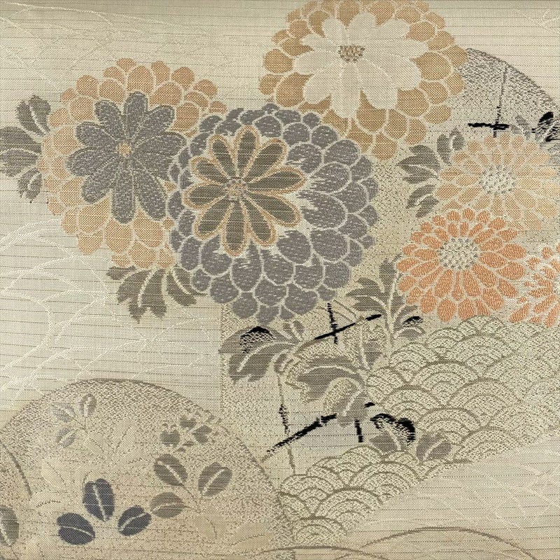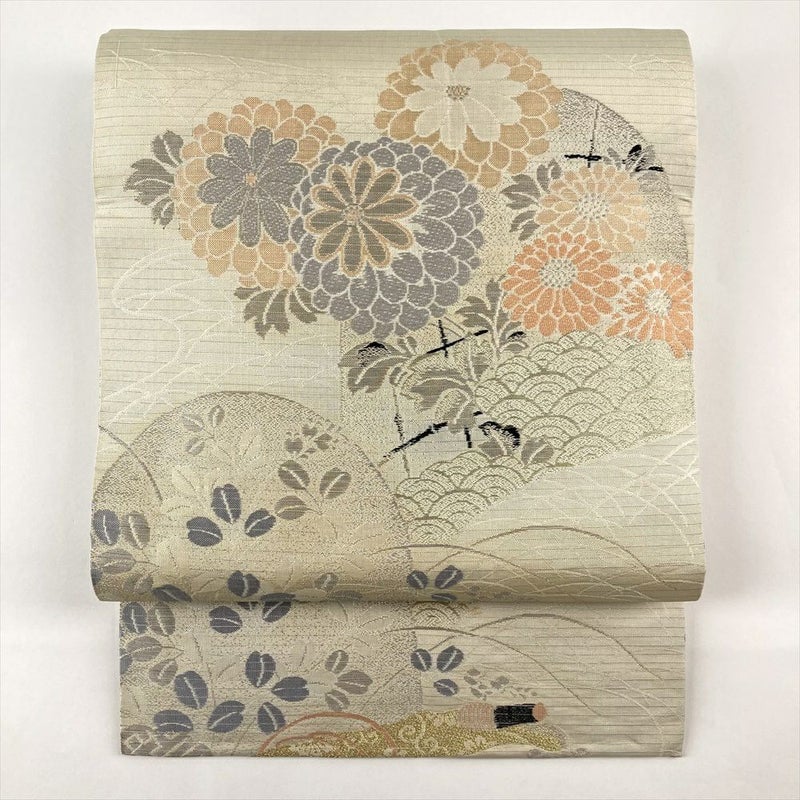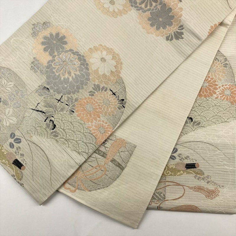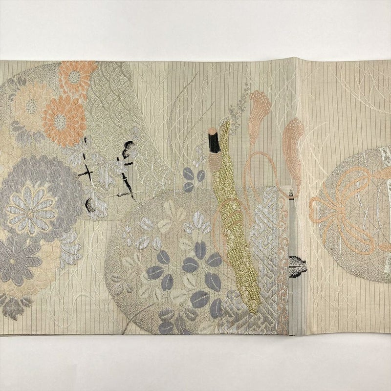(中古)夏京袋帯 生成り セミフォーマル カジュアル 六通 絽 金糸 銀糸 刺繍 虫篭 篠笛 萩 菊 露芝