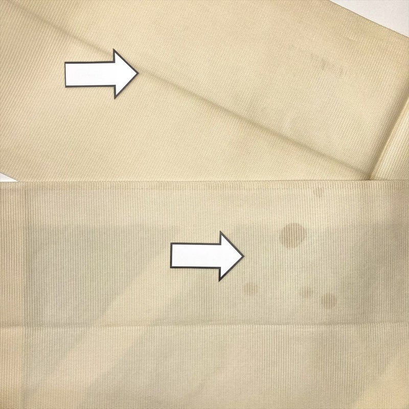 夏帯は透け感のある素材で作られているため、見た目にも涼しげです。色や柄、素材など、さまざまなバリエーションがあります。お気に入りの夏帯で装いをお楽しみください。表裏全体に汚れが点在しています。保存臭がややございます。前柄から手先に折シワがございます。