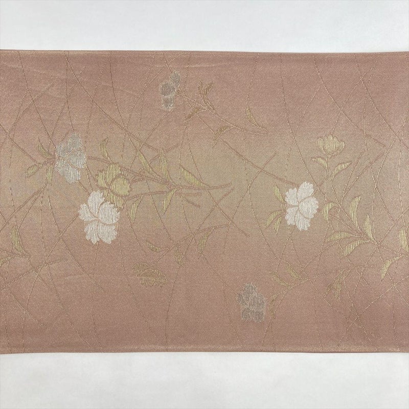 柔らかなピンクベージュに、可憐ななでしこと露芝が涼やかに舞う夏袋帯。