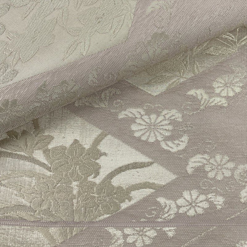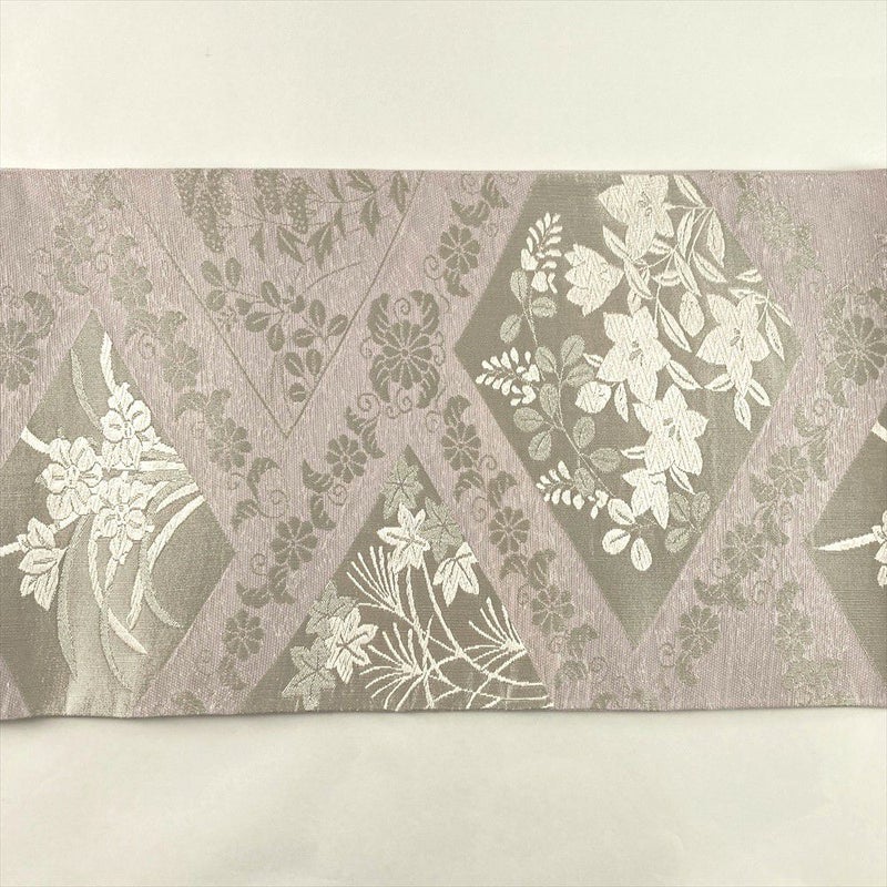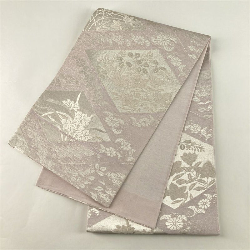 (中古)夏袋帯 薄藤 紫 セミフォーマル 六通 織り 菱に四季花 絹