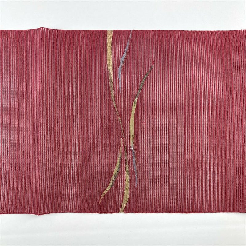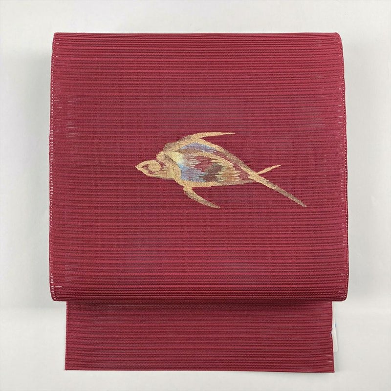 (中古)夏名古屋帯 臙脂 赤 カジュアル 松葉仕立て 絽綴れ 金糸 鳥