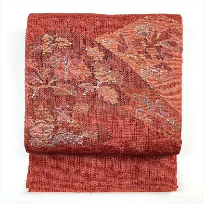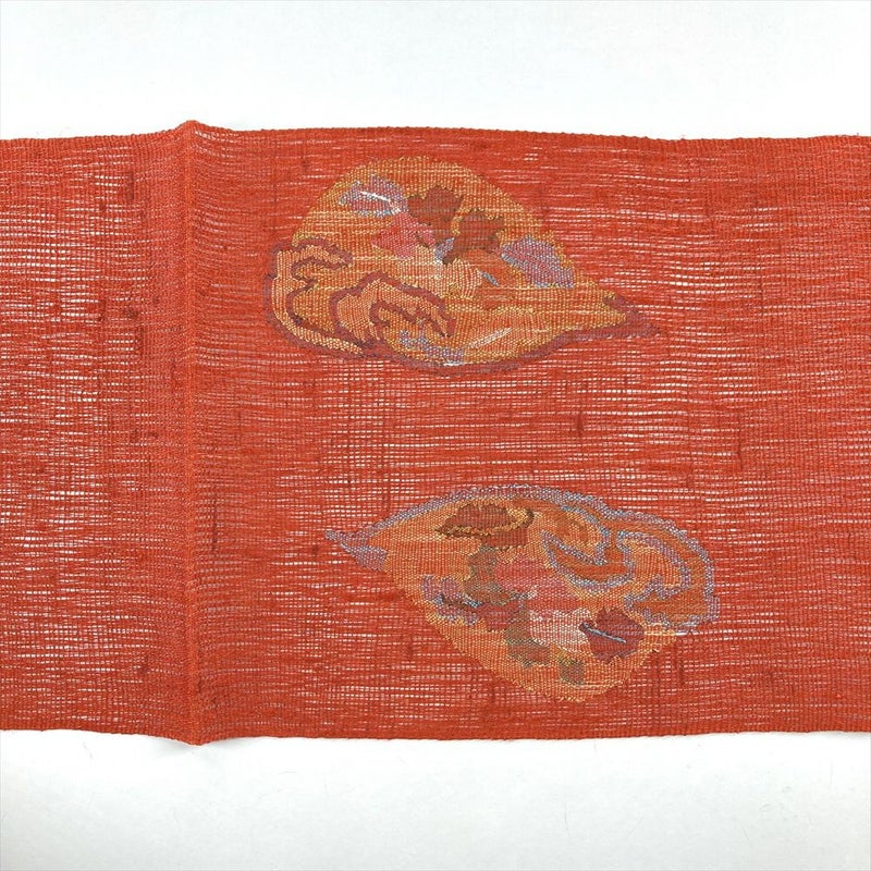 (中古)夏名古屋帯 赤橙 オレンジ カジュアル 松葉仕立て 織り 山並み 四季花