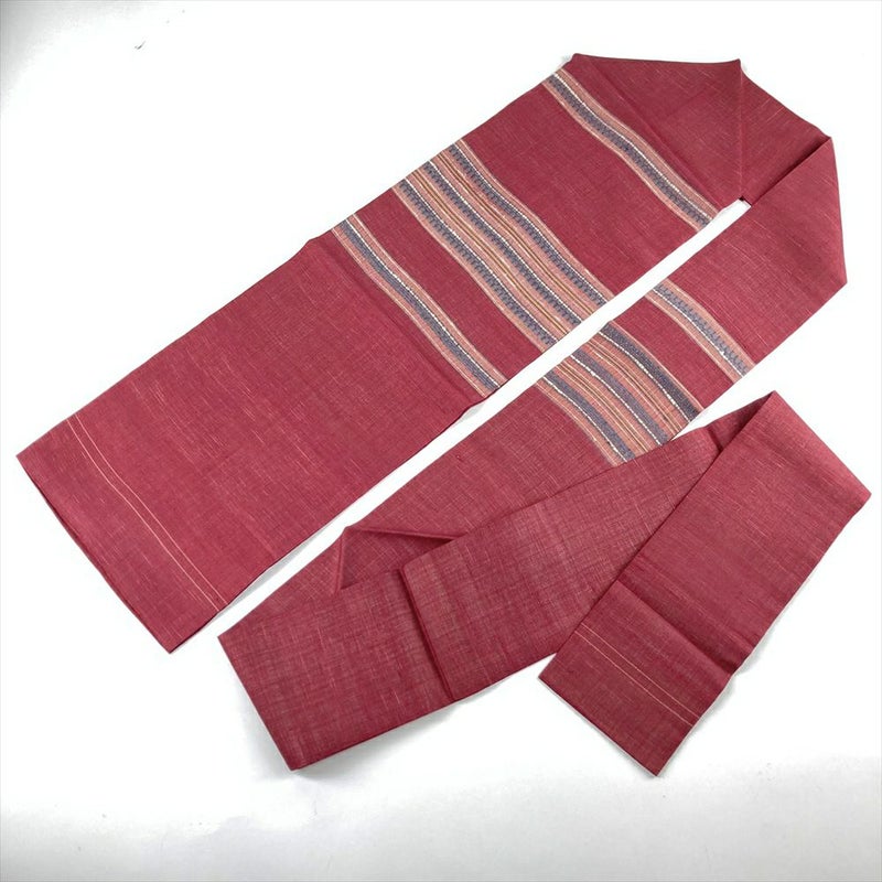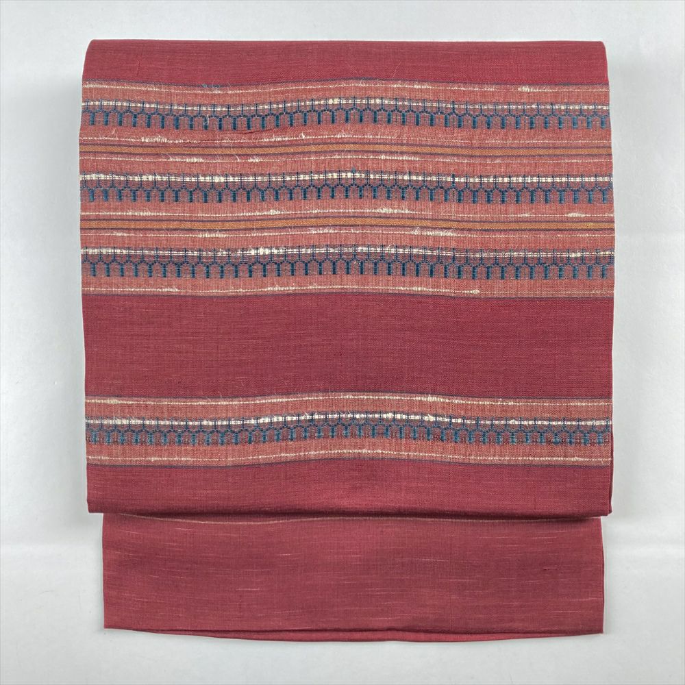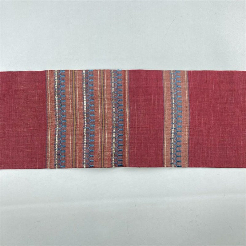 (中古)夏名古屋帯 臙脂 赤 カジュアル 名古屋仕立て 織り 横段 幾何学