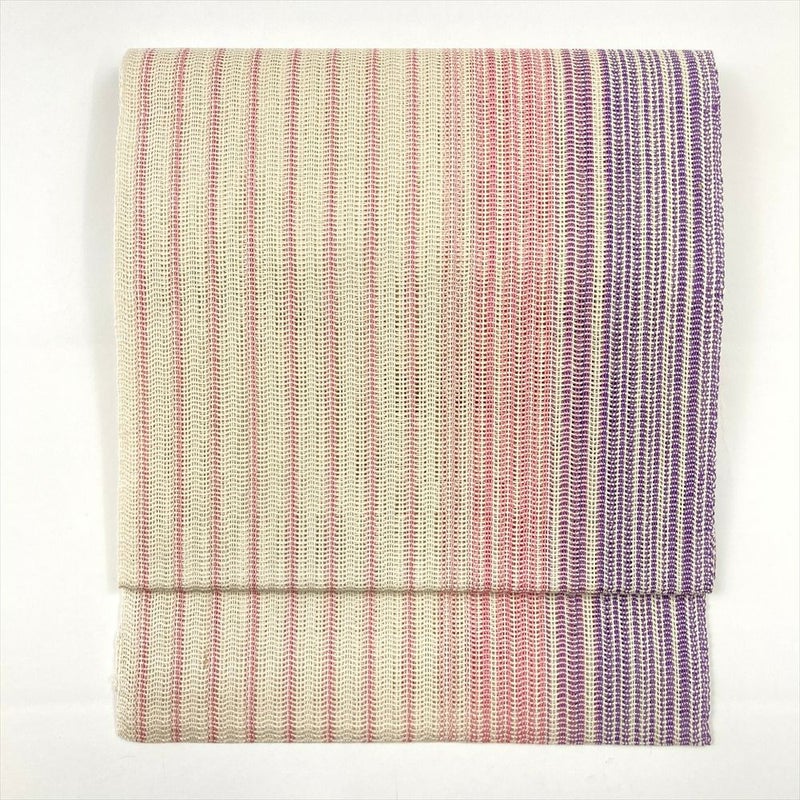 (中古)夏名古屋帯 紫 ピンク カジュアル 平仕立て 織り 縞 グラデーション 未使用