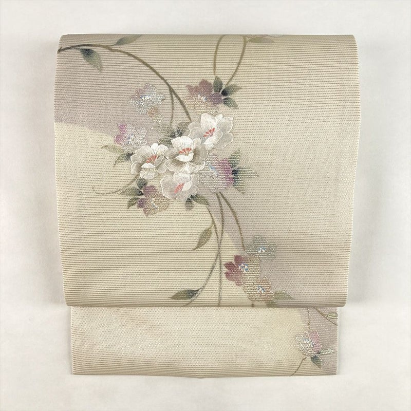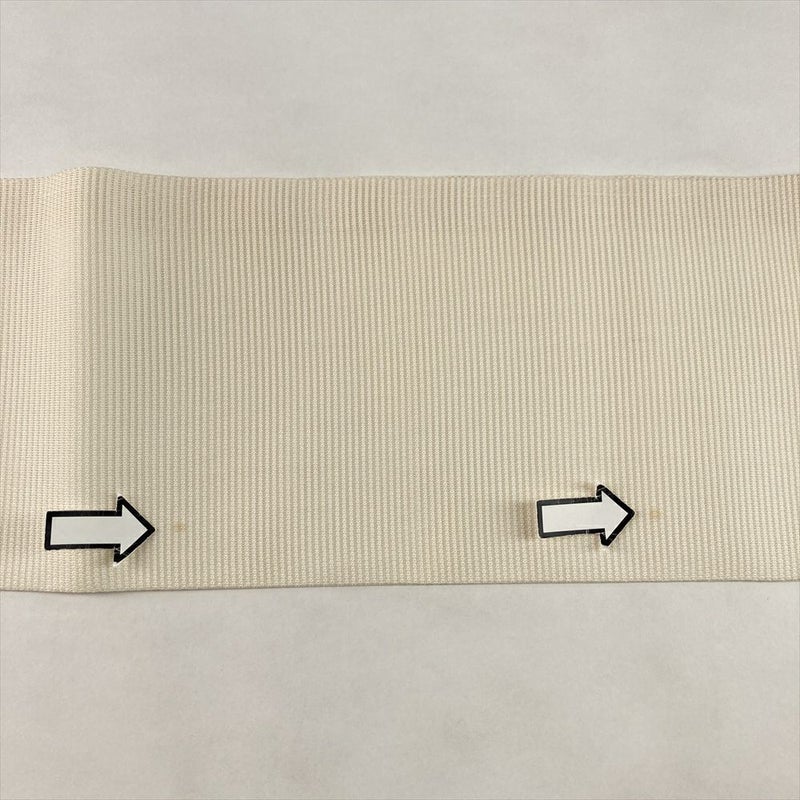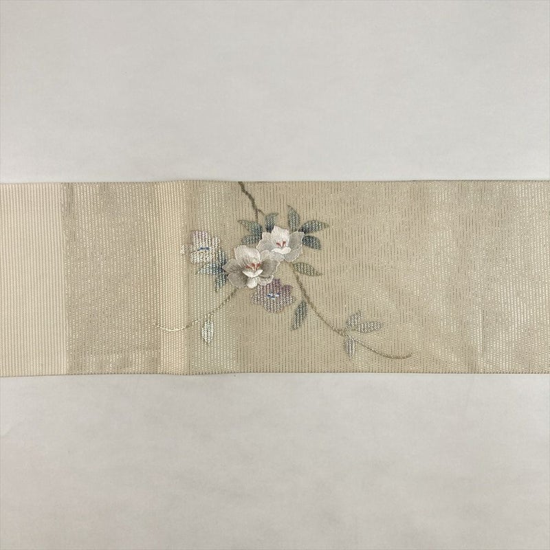 (中古)夏名古屋帯 アイボリー 生成り カジュアル 名古屋仕立て 絽 金銀彩 刺繍 すらり 花草文 絹