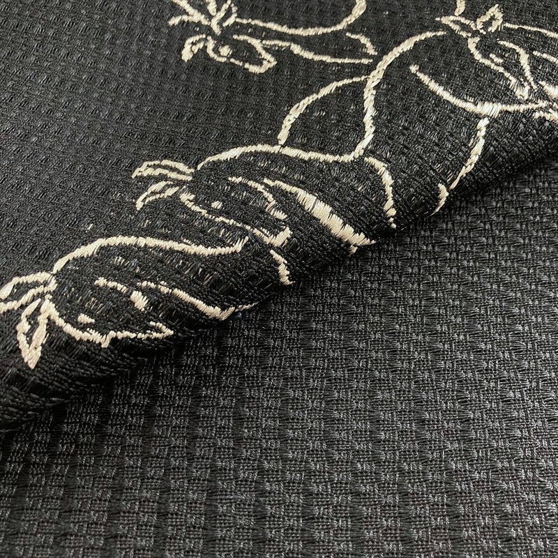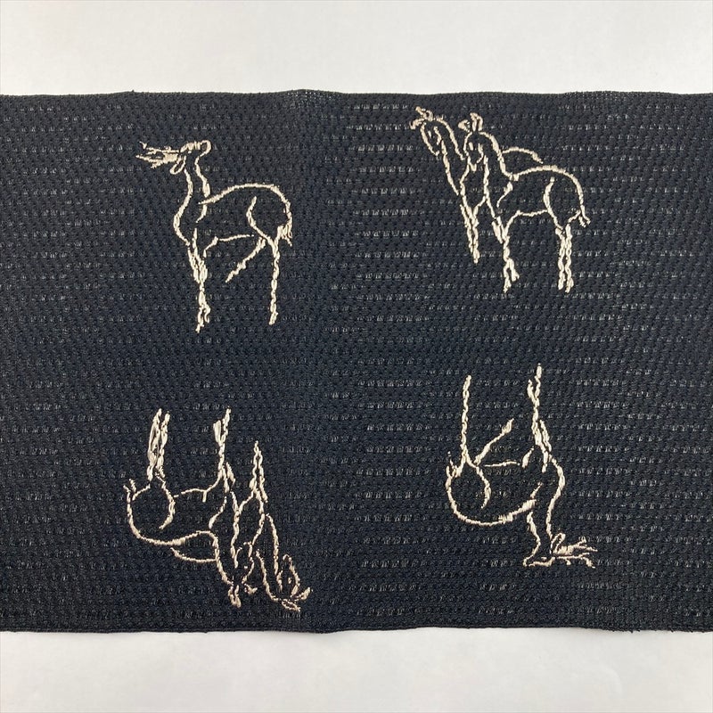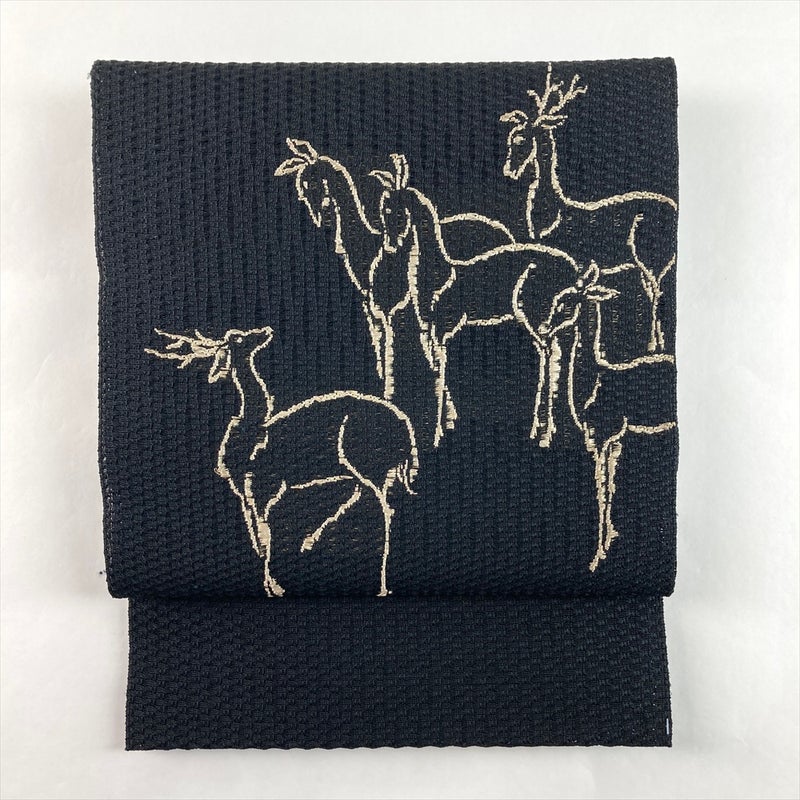 涼やかな透け感のある黒地に、凛とした鹿の意匠が映える夏八寸名古屋帯です。