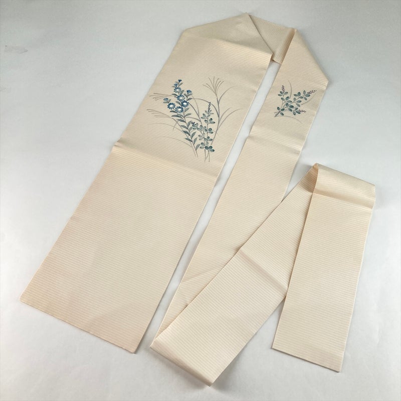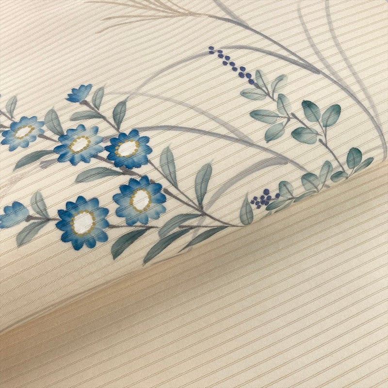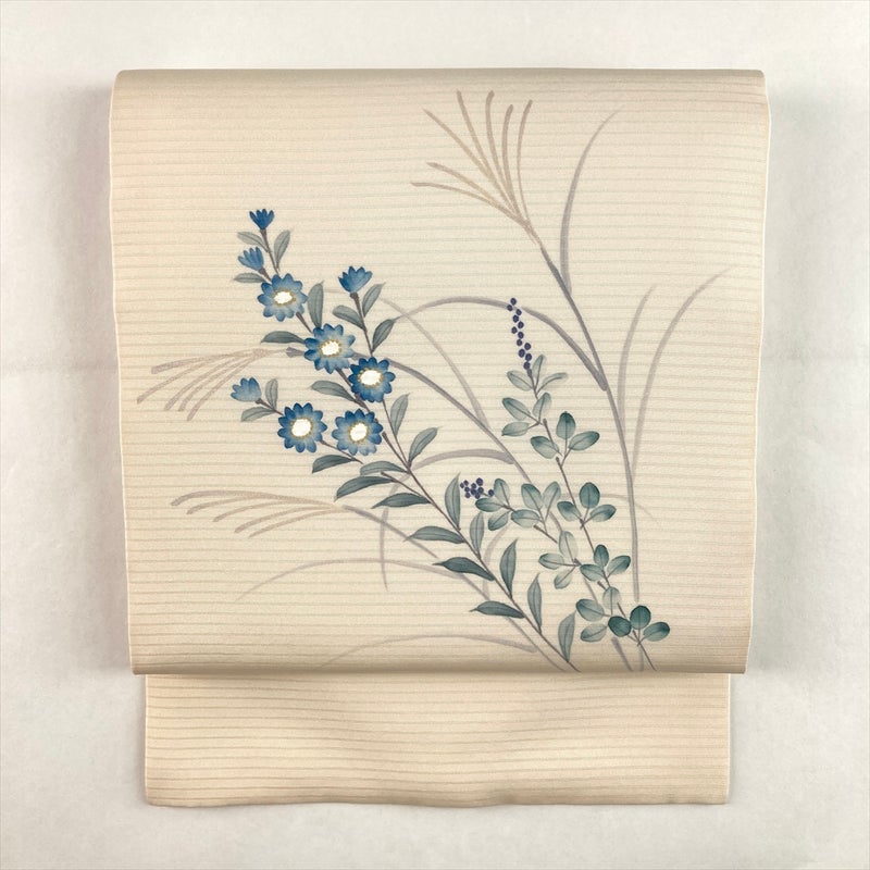やわらかな生成地の絽に、手描きで花とススキをのびやかに表現した夏九寸名古屋帯。