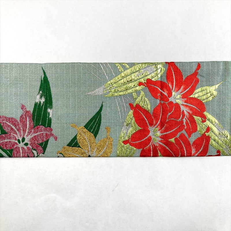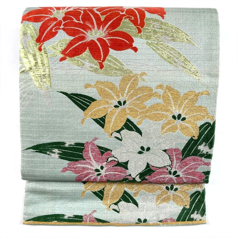 淡くやさしい薄緑地に、すらりと咲く百合文様が涼感を誘うヴィンテージ夏名古屋帯。