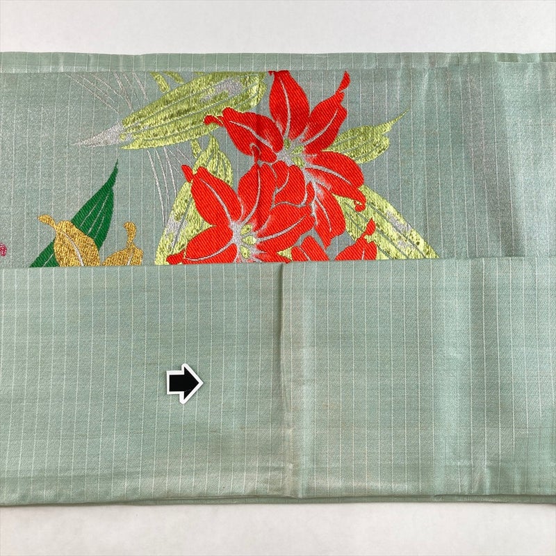 (中古)夏名古屋帯 薄緑 ヴィンテージ 名古屋仕立て 織り 百合 絹 未洗い